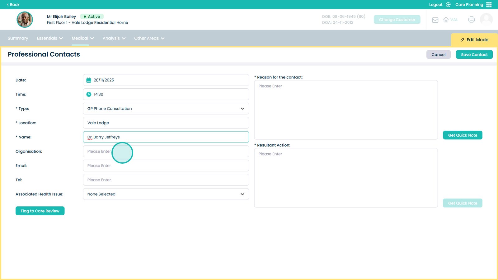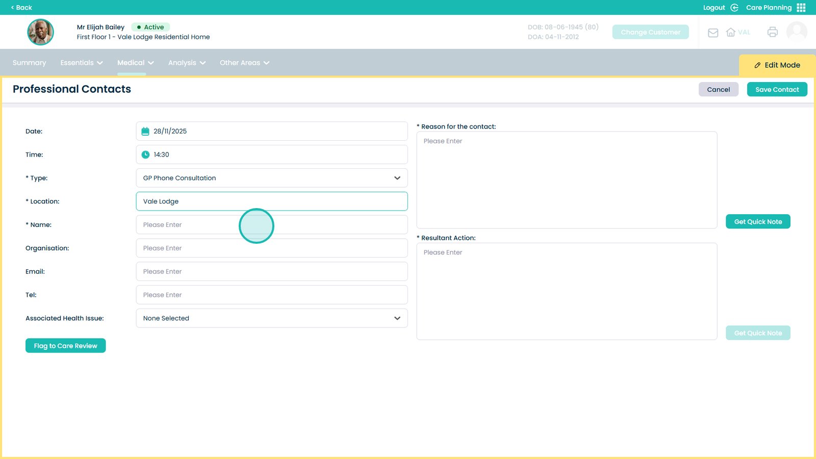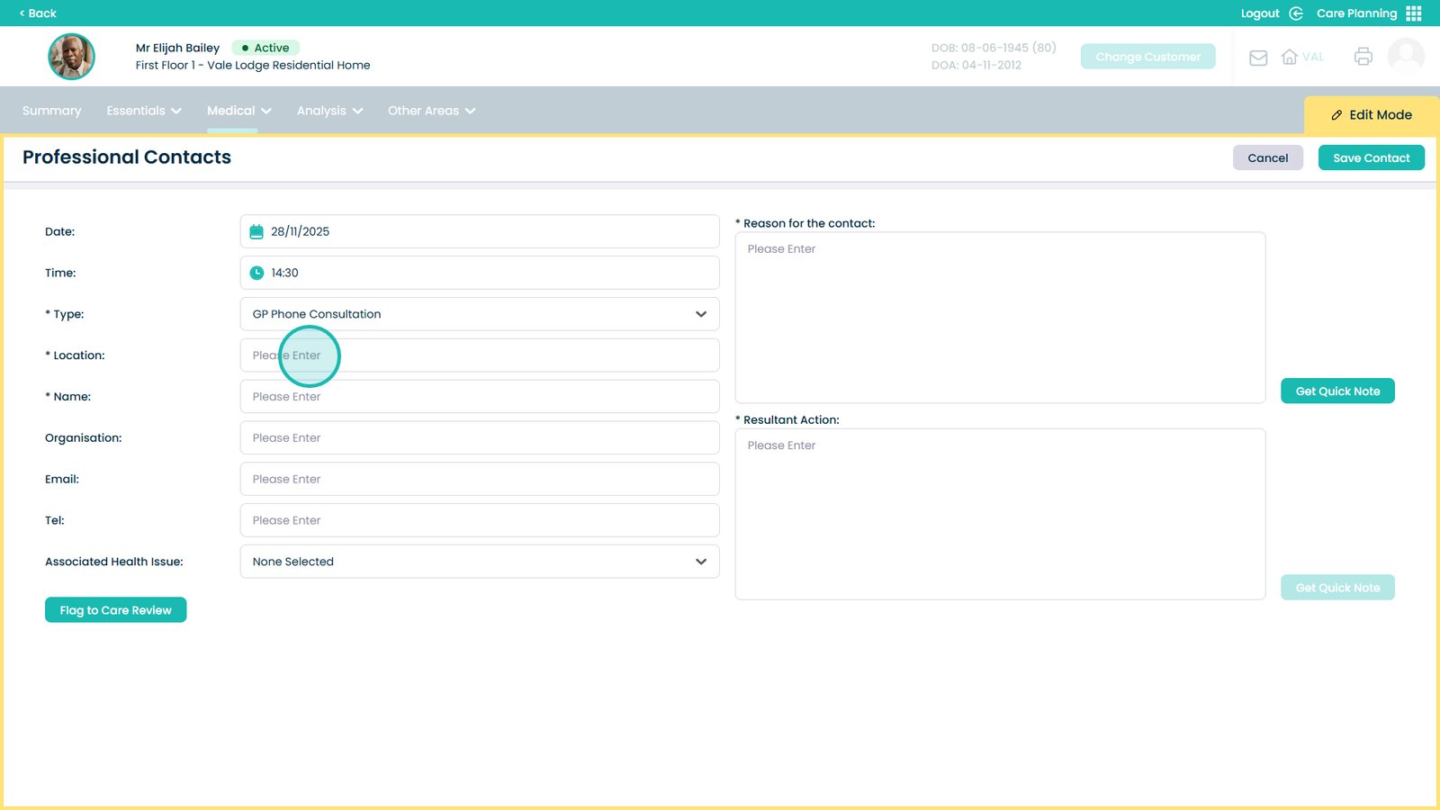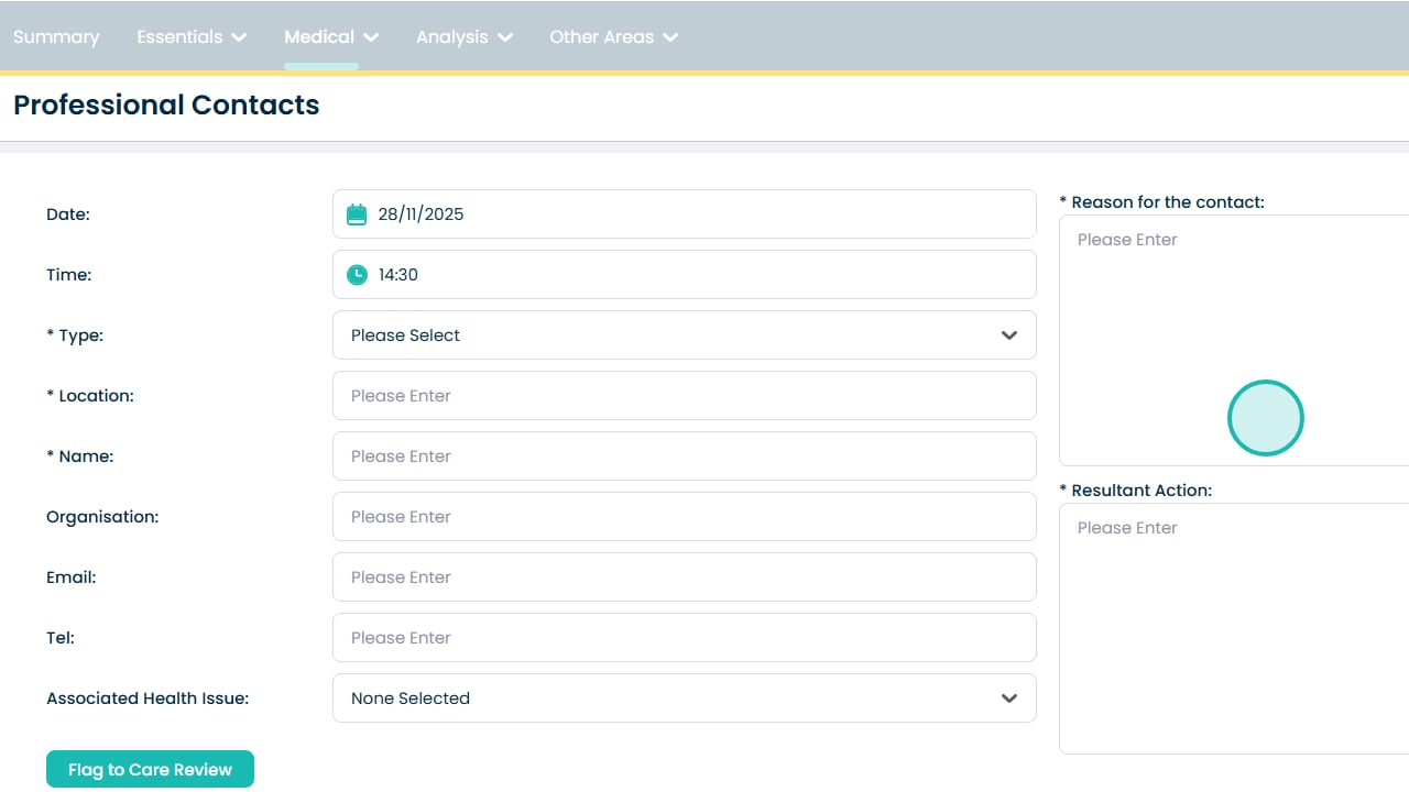 This guide explains how to record a new Professional Contact within the Care Planning App. Professional Contacts are an important part of tracking a customer’s healthcare interactions, such as GP visits, specialist appointments, district nurse visits, therapy sessions, and other professional visits.