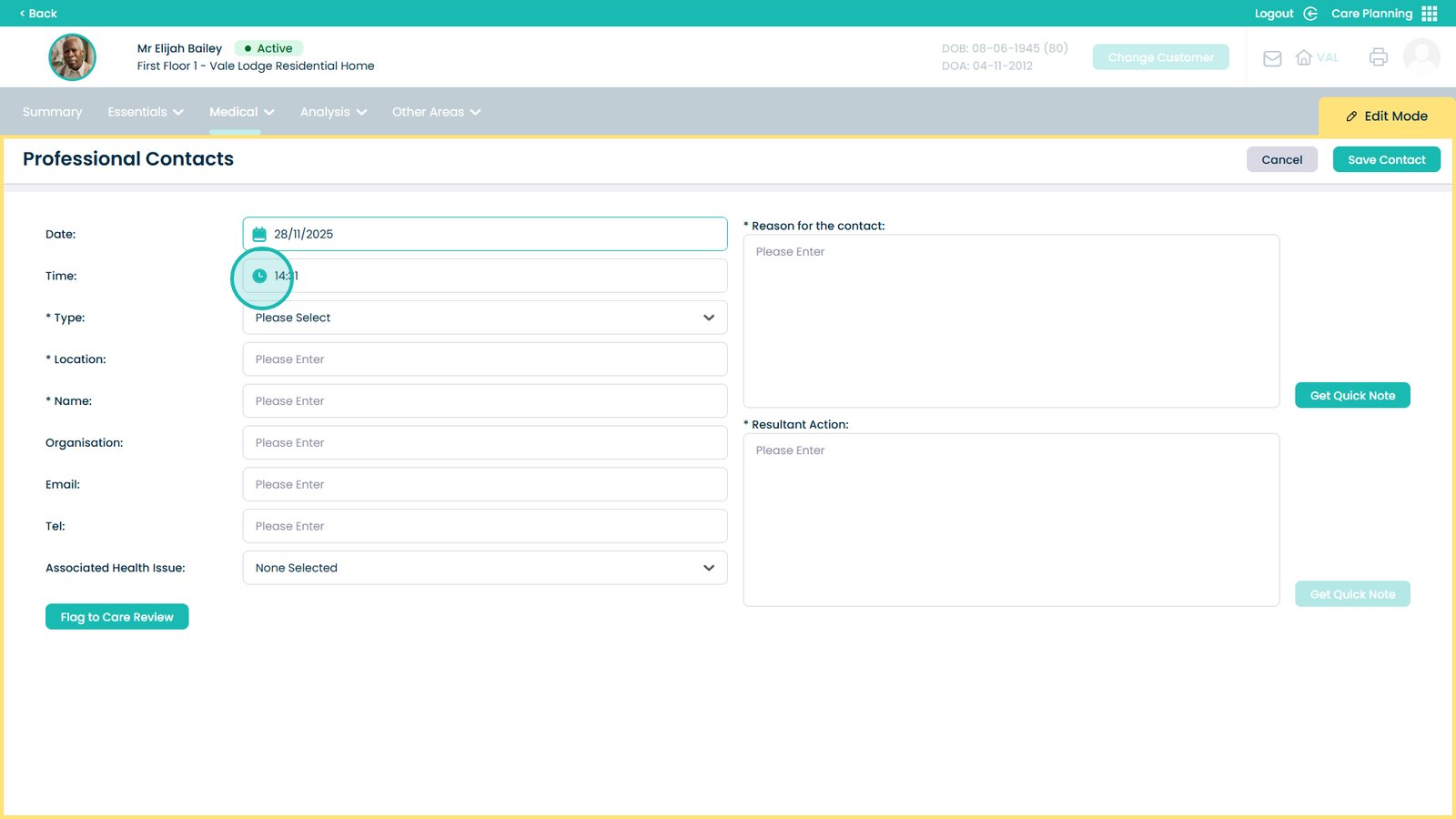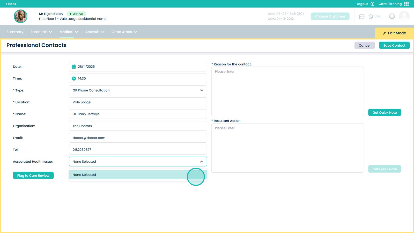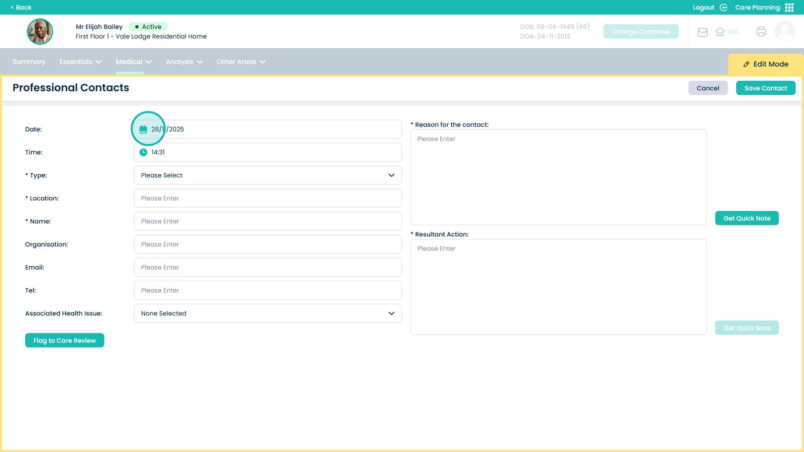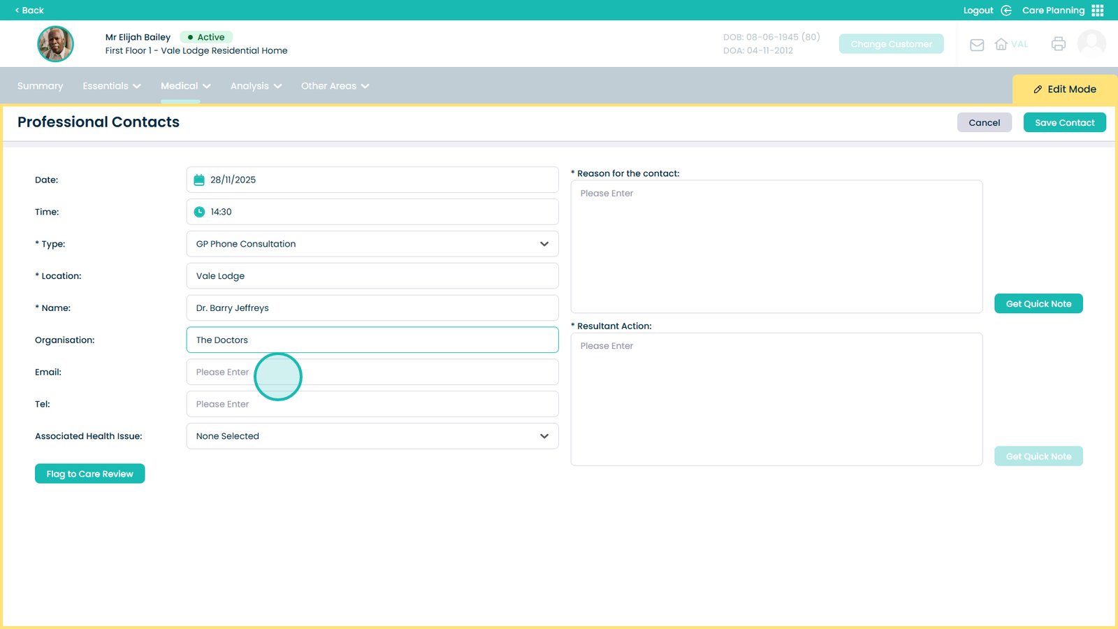 This guide explains how to record a new Professional Contact within the Care Planning App. Professional Contacts are an important part of tracking a customer’s healthcare interactions, such as GP visits, specialist appointments, district nurse visits, therapy sessions, and other professional visits.