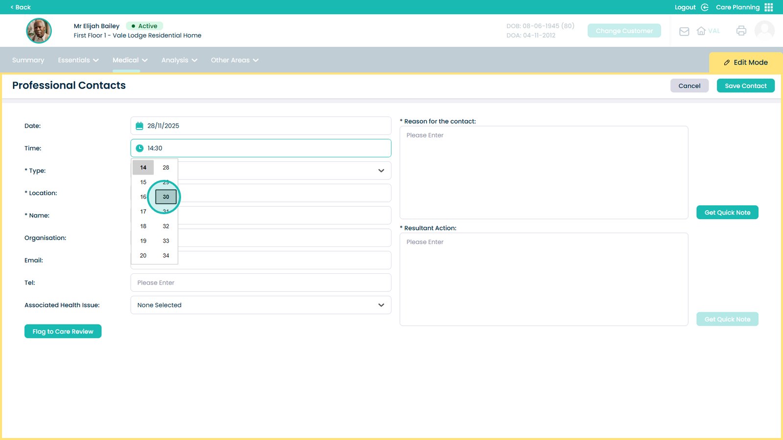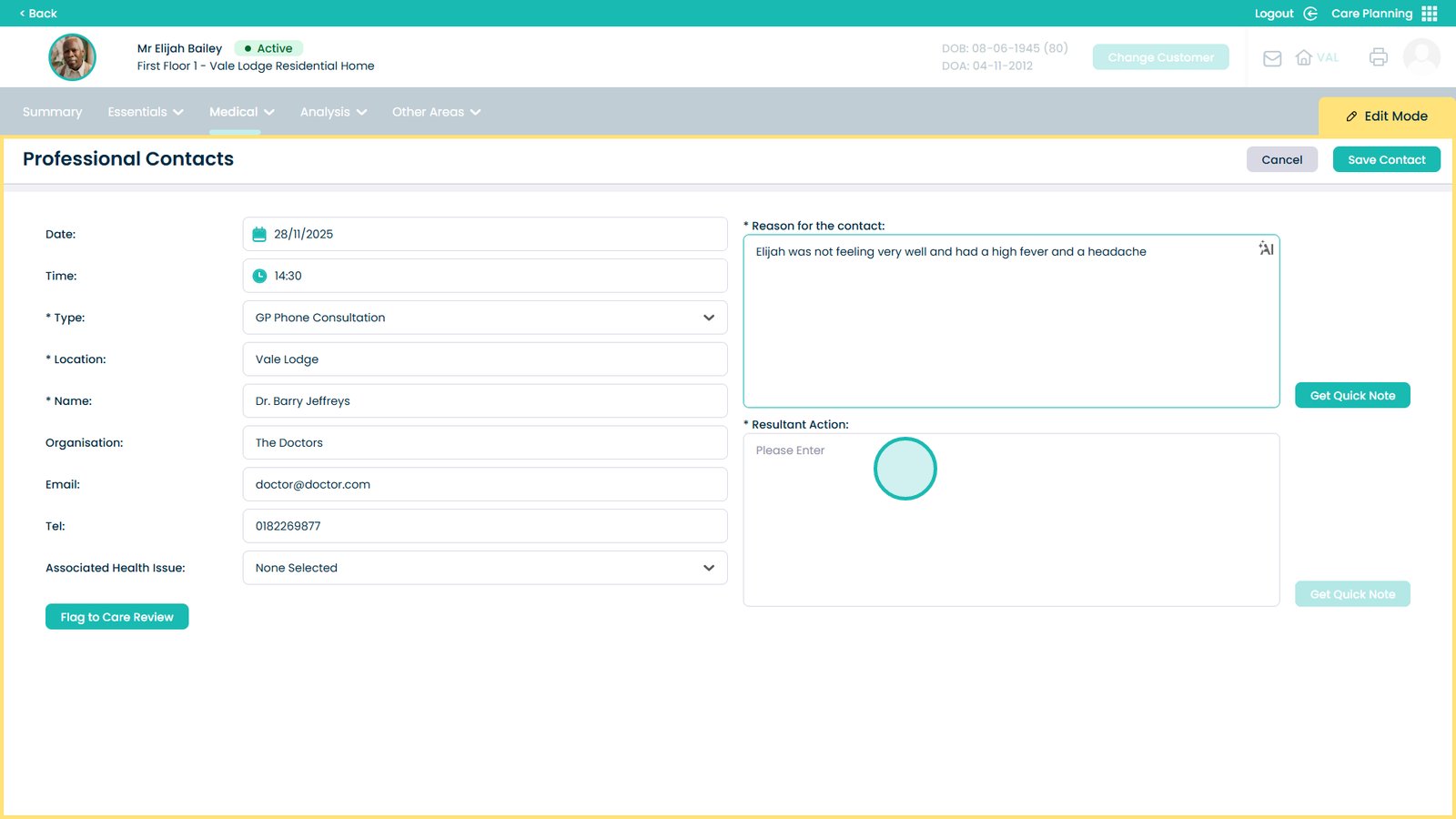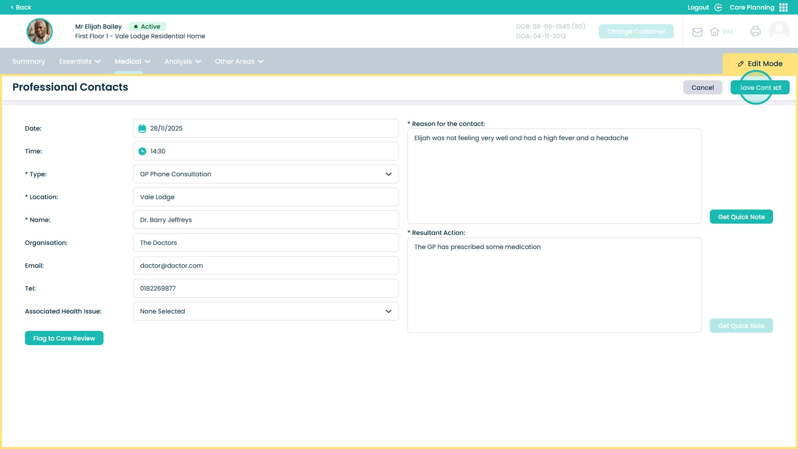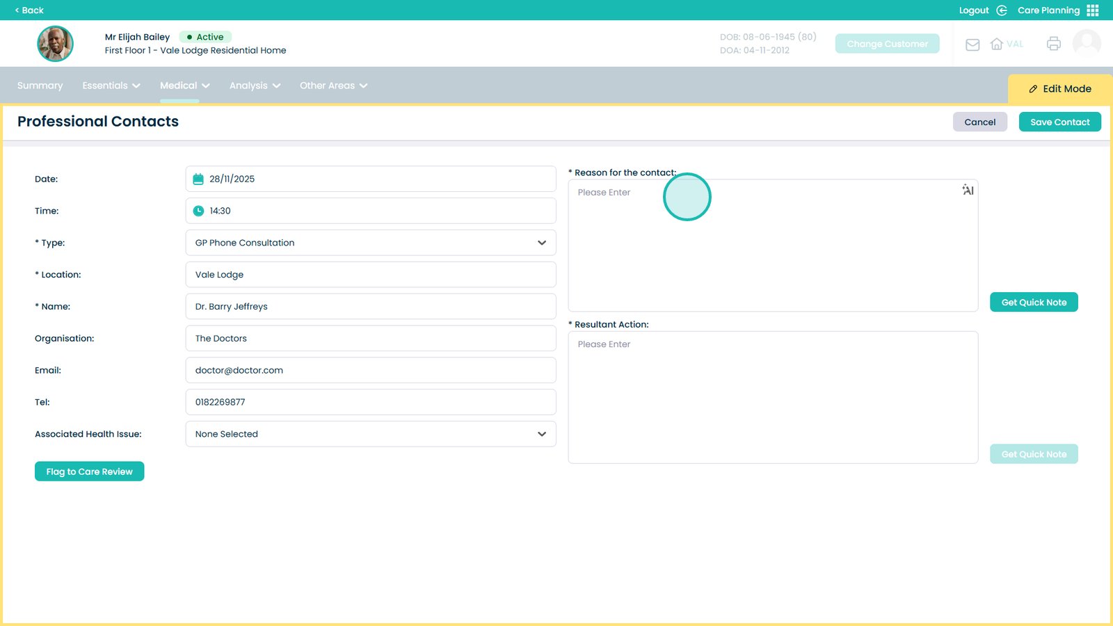 This guide explains how to record a new Professional Contact within the Care Planning App. Professional Contacts are an important part of tracking a customer’s healthcare interactions, such as GP visits, specialist appointments, district nurse visits, therapy sessions, and other professional visits.
