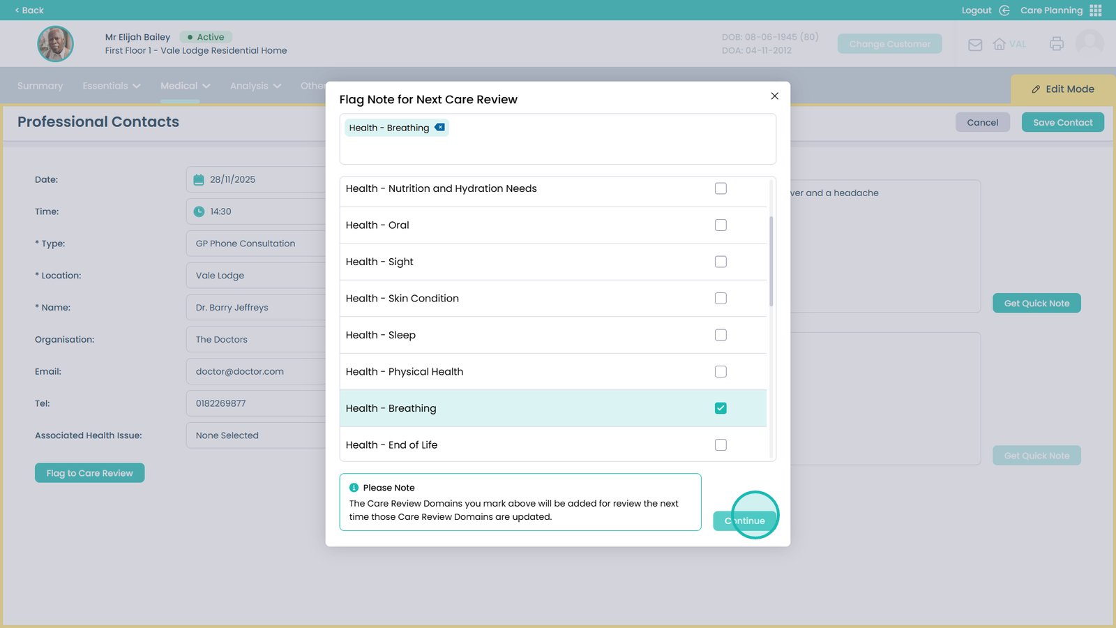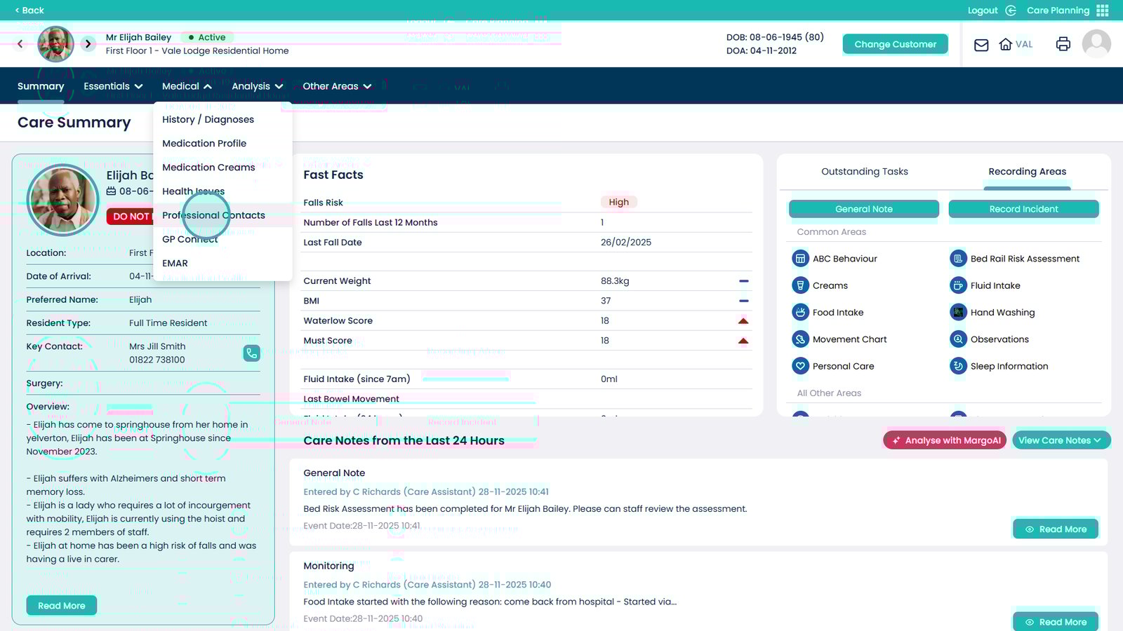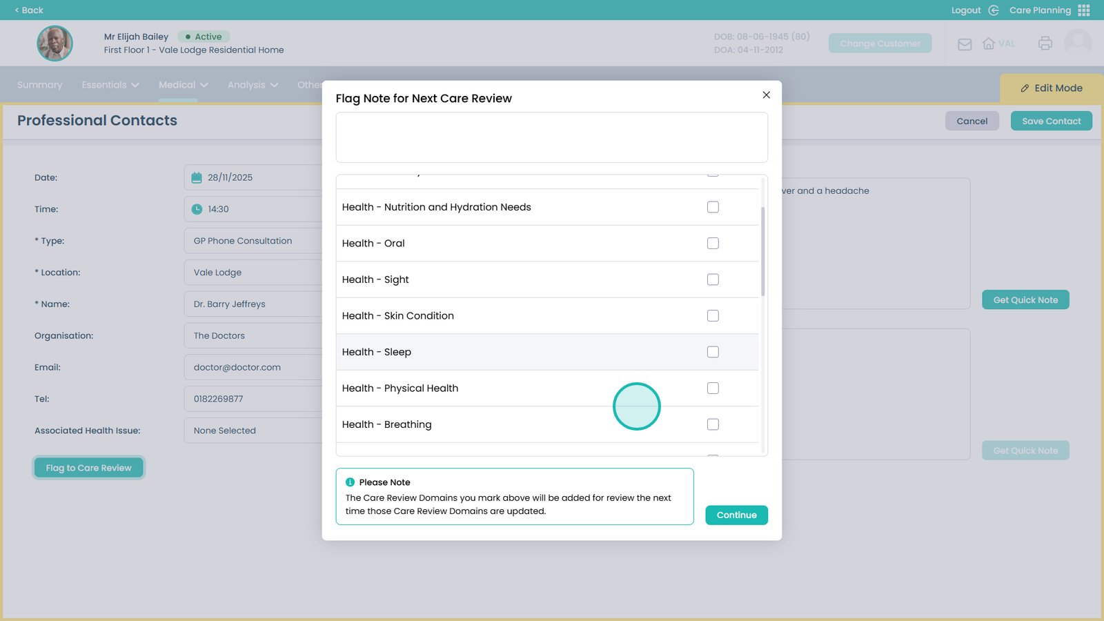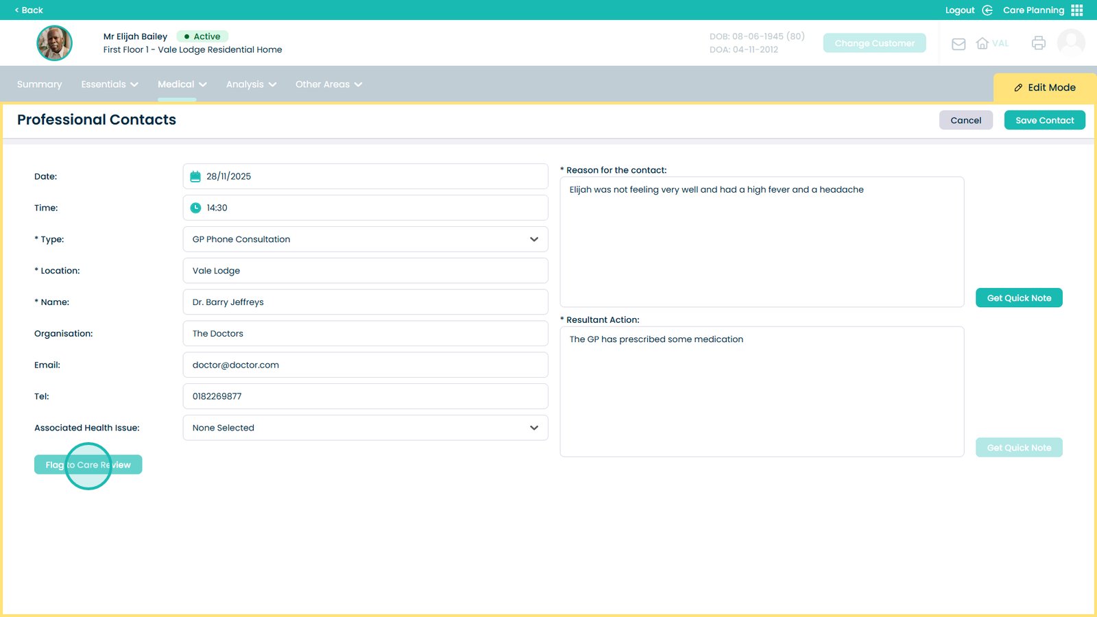 This guide explains how to record a new Professional Contact within the Care Planning App. Professional Contacts are an important part of tracking a customer’s healthcare interactions, such as GP visits, specialist appointments, district nurse visits, therapy sessions, and other professional visits.
