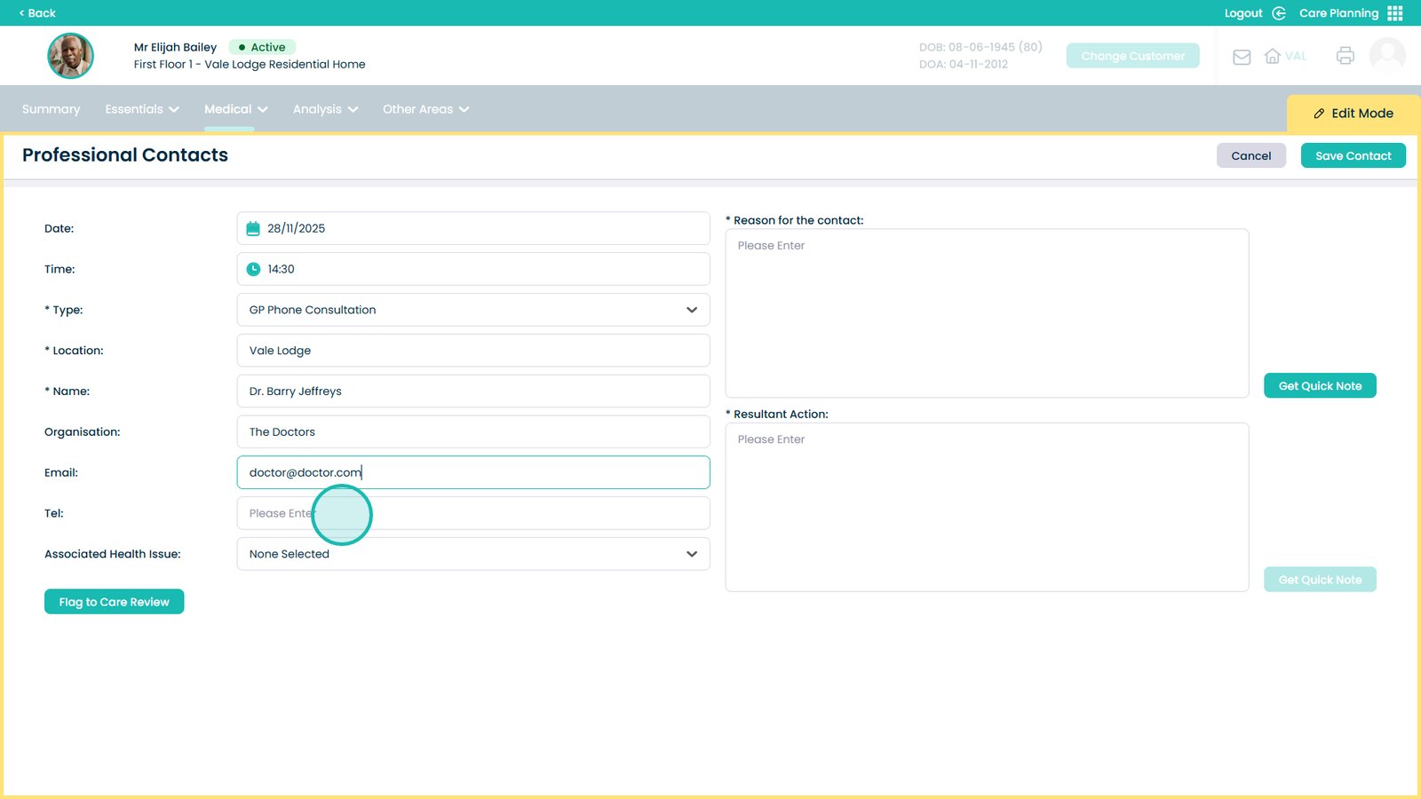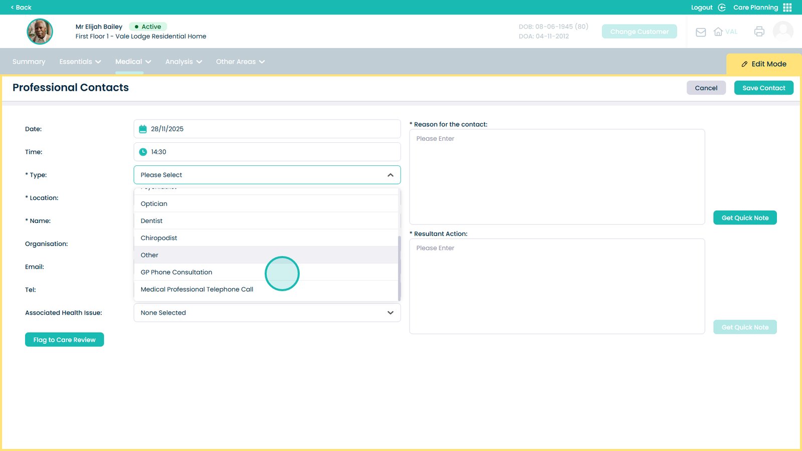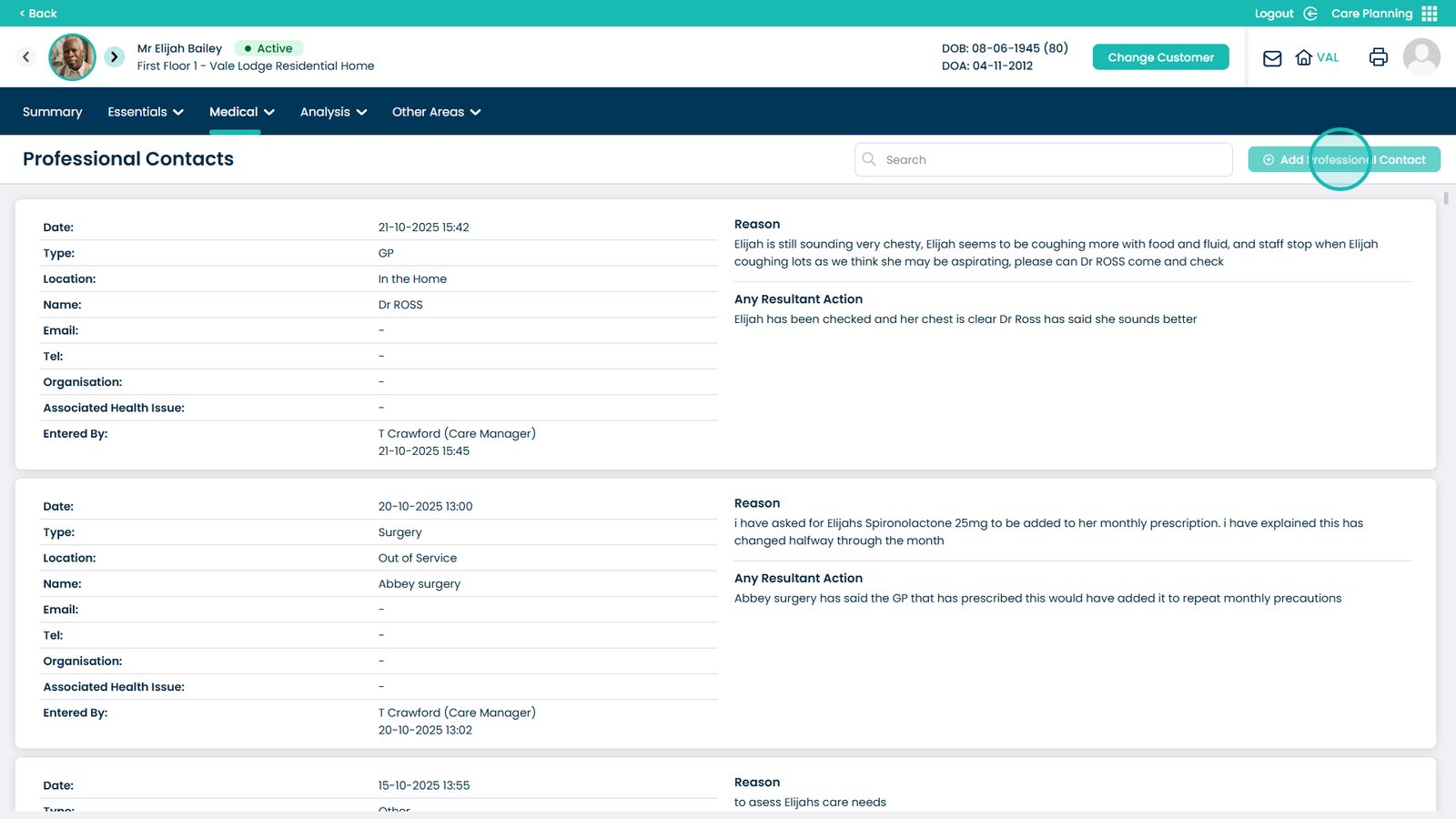 Adding these details helps keep the customer’s medical history accurate, supports safer care planning, and ensures all external professionals involved in their care are clearly documented. Use this guide whenever you need to log a new professional contact, update the information linked to a visit, or make sure that all professional interactions are recorded correctly.