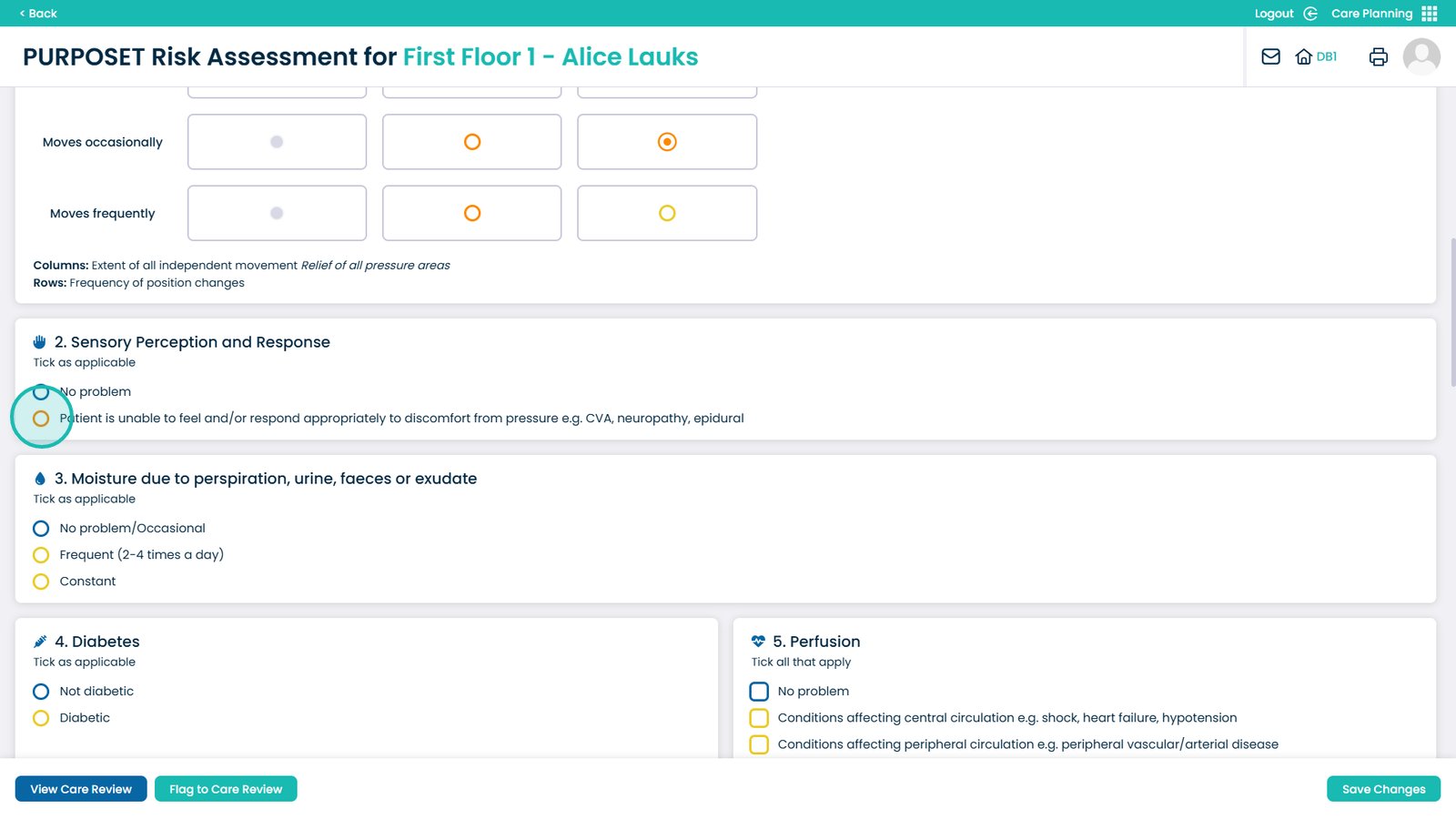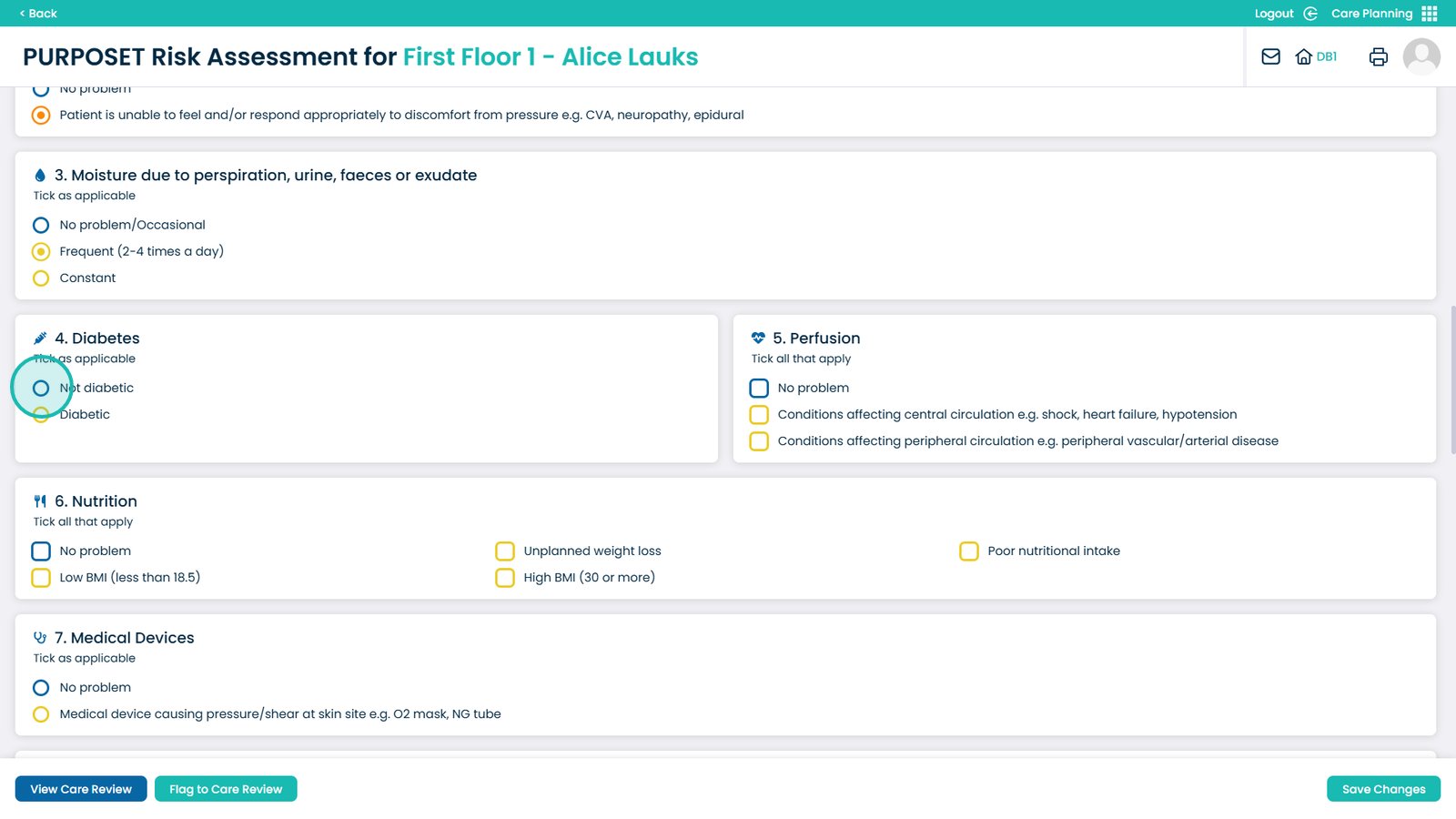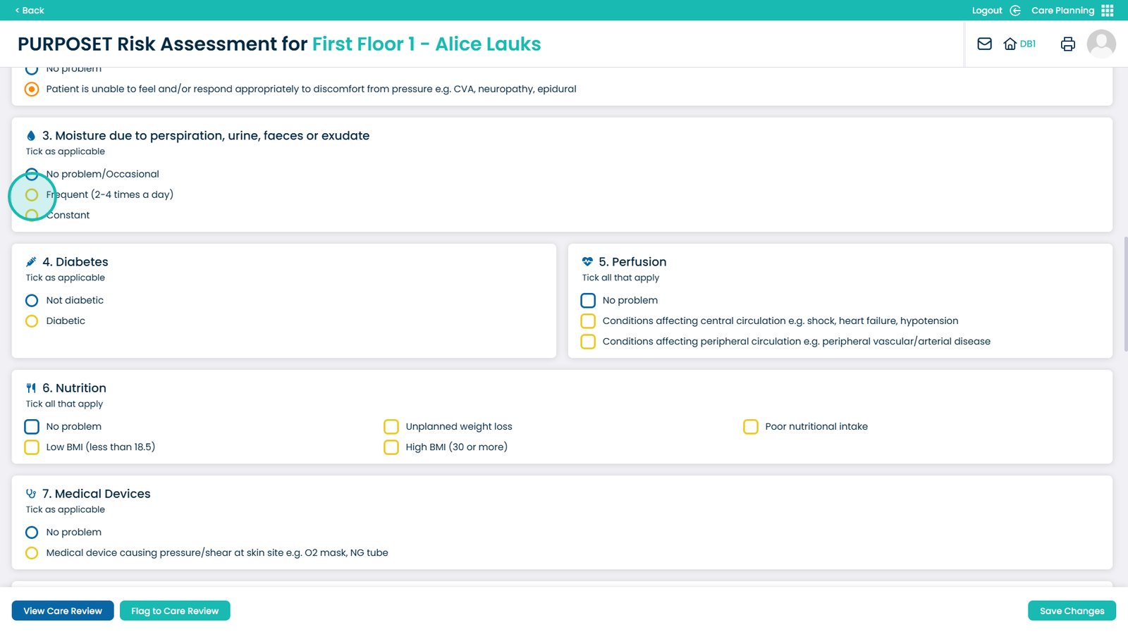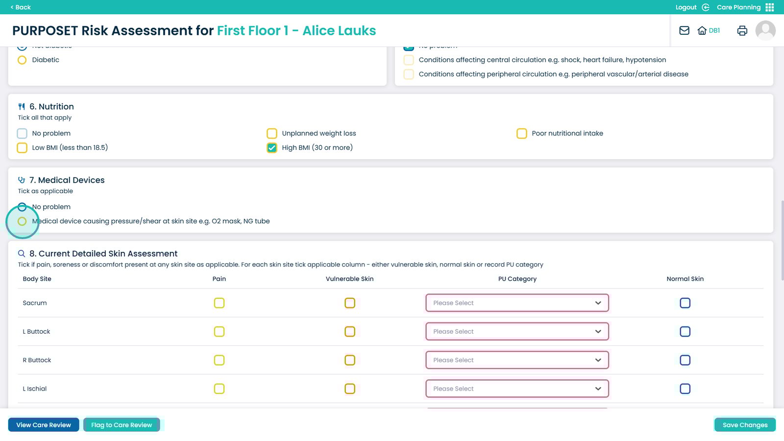 Now fill out the form using all of the options that apply to the service user. This example will show a higher risk of pressure ulcers