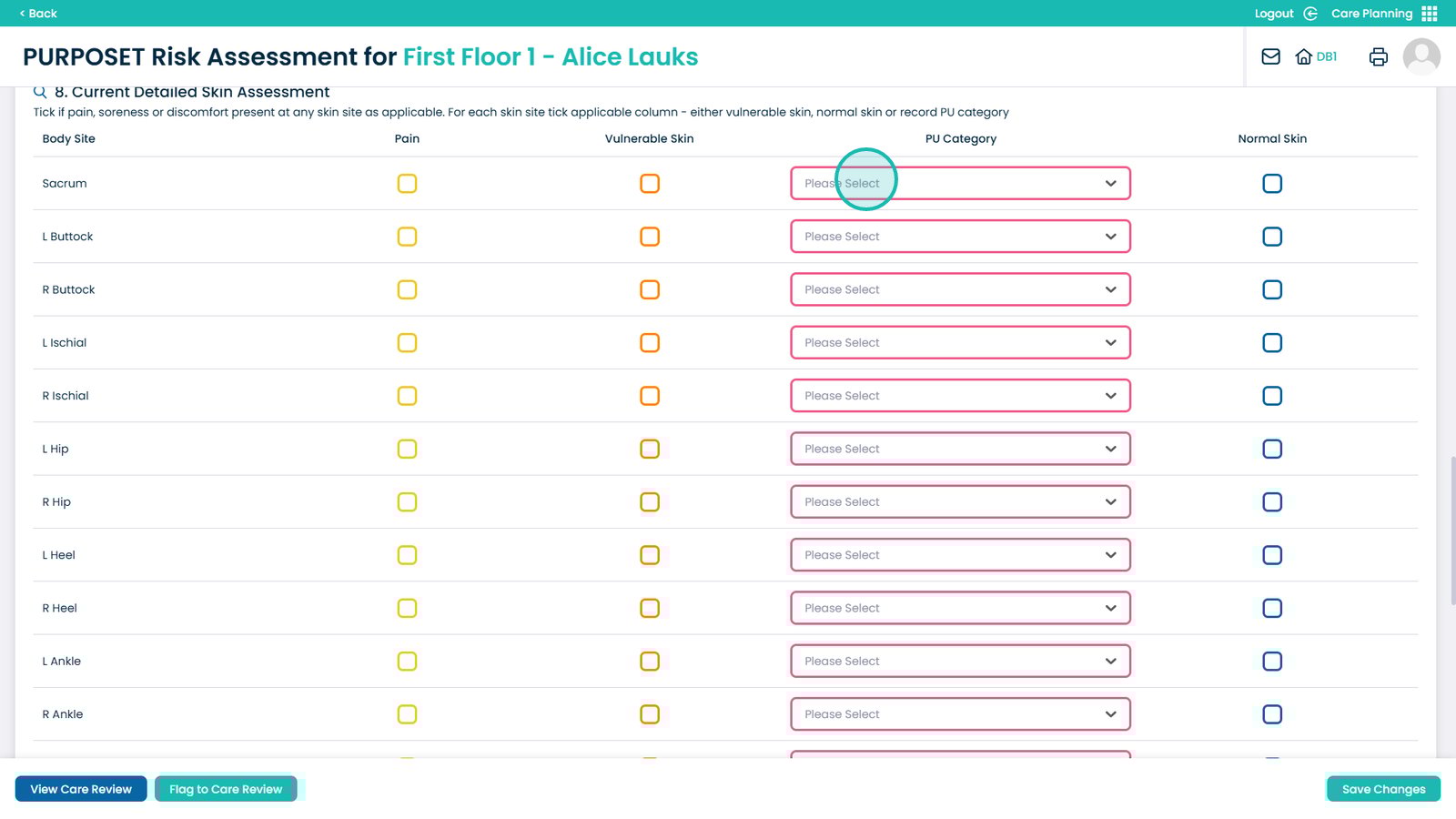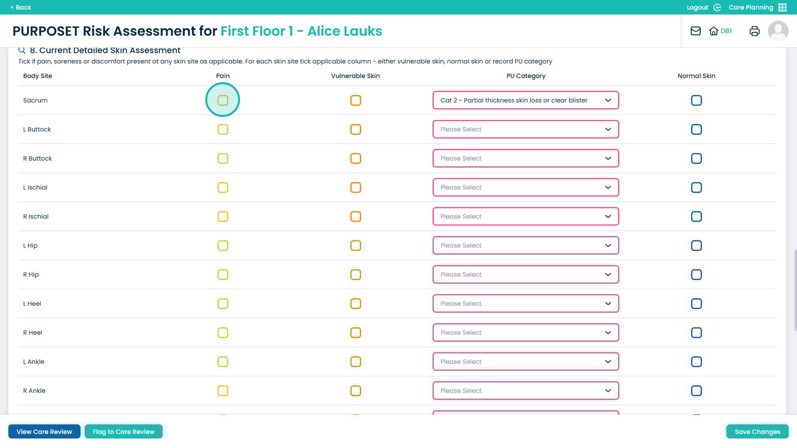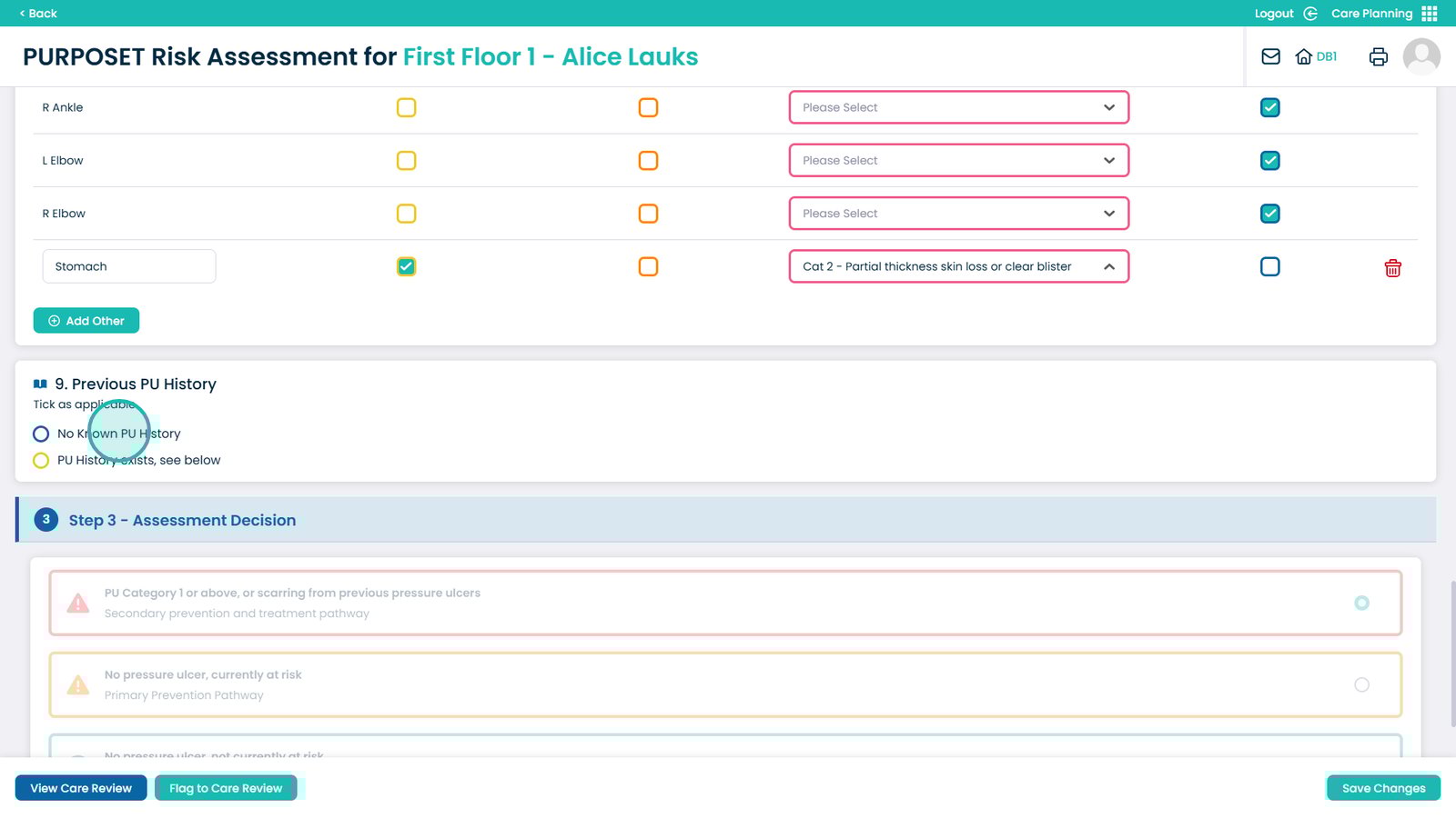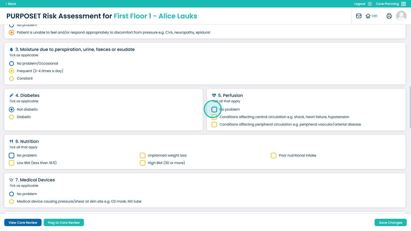 Now fill out the form using all of the options that apply to the service user. This example will show a higher risk of pressure ulcers