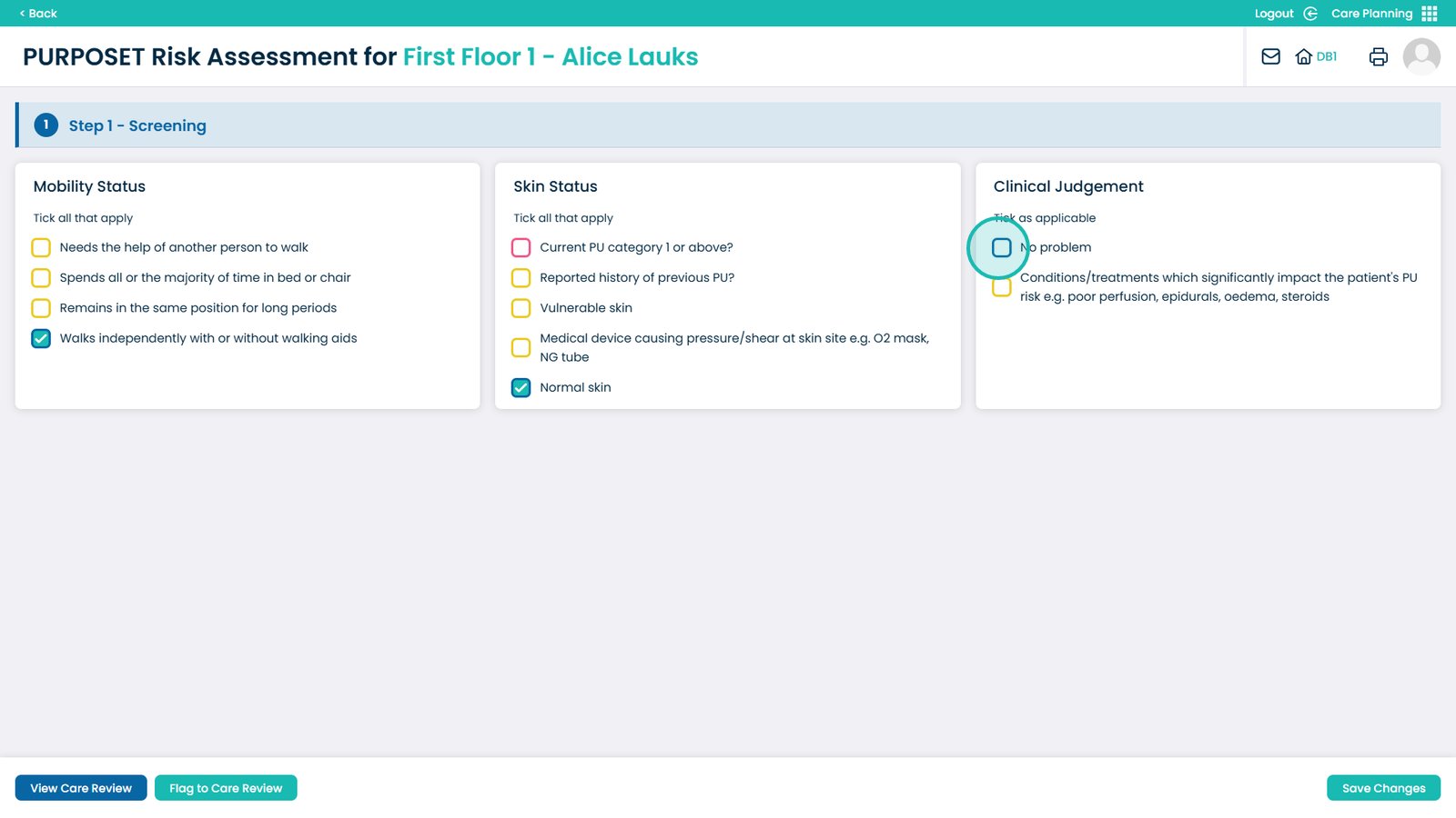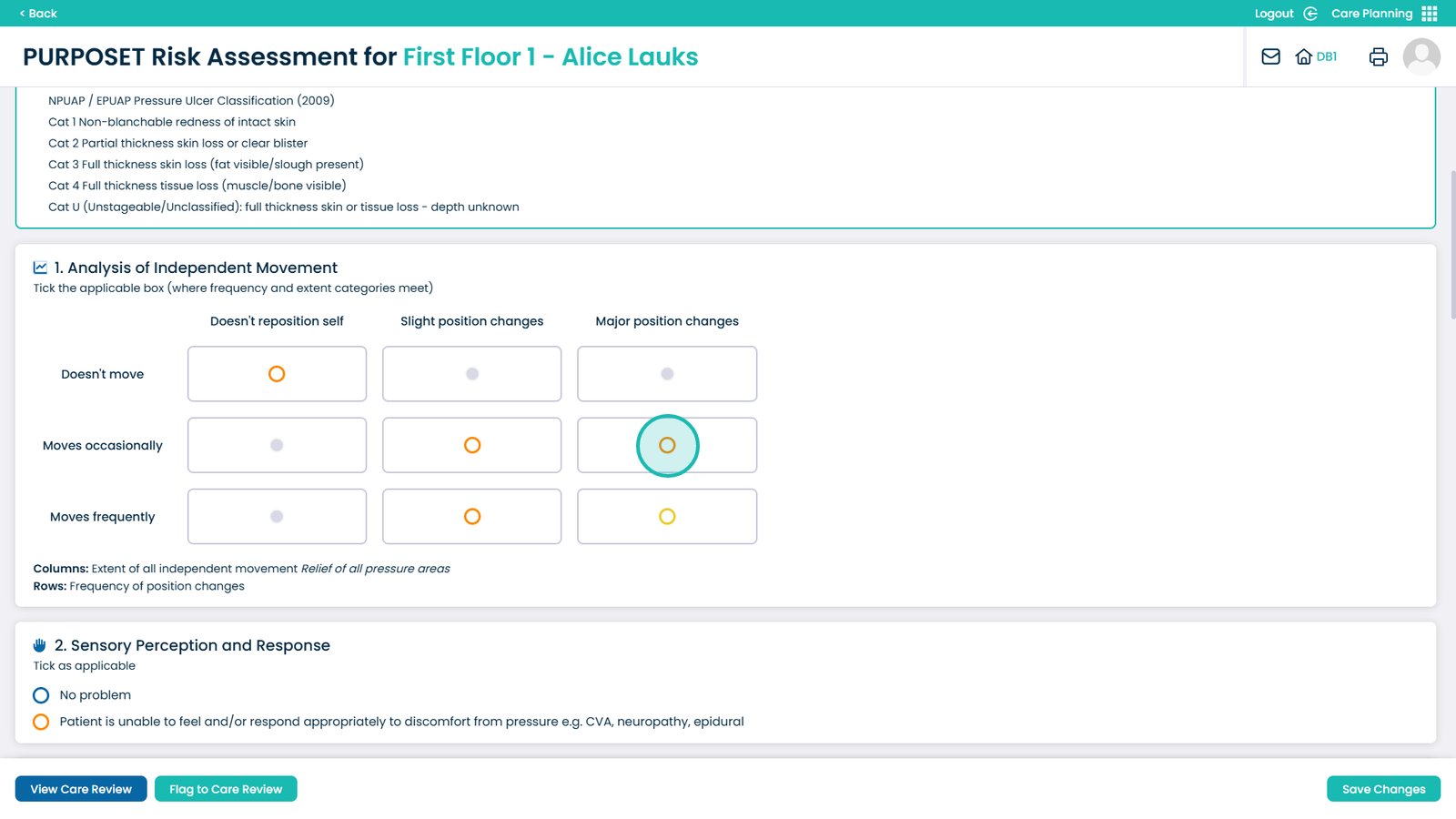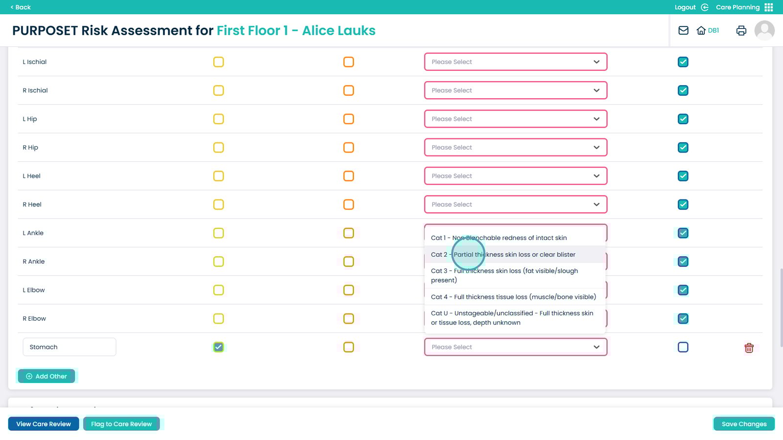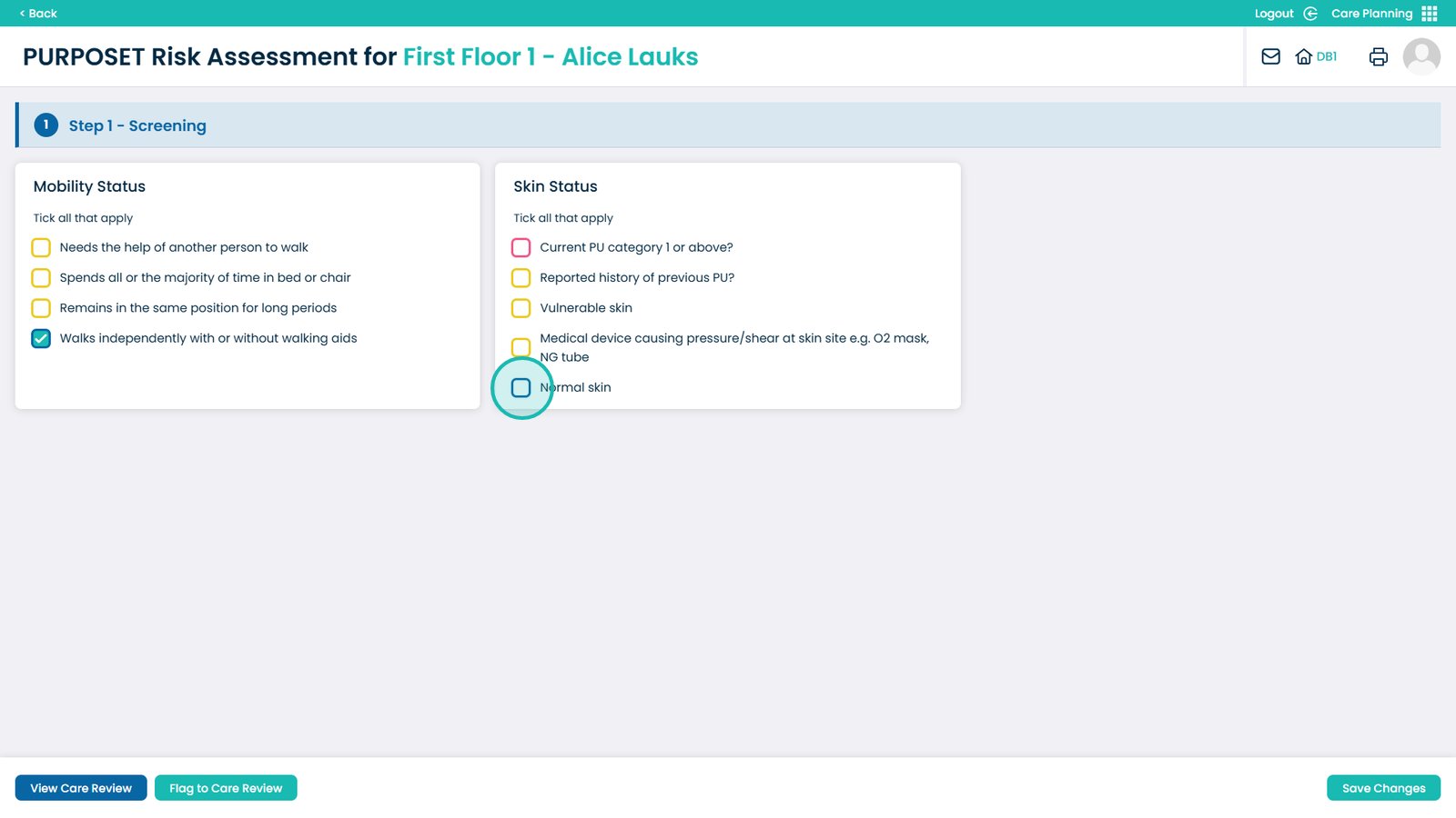 Now fill out the form using all of the options that apply to the service user. This example will show a higher risk of pressure ulcers