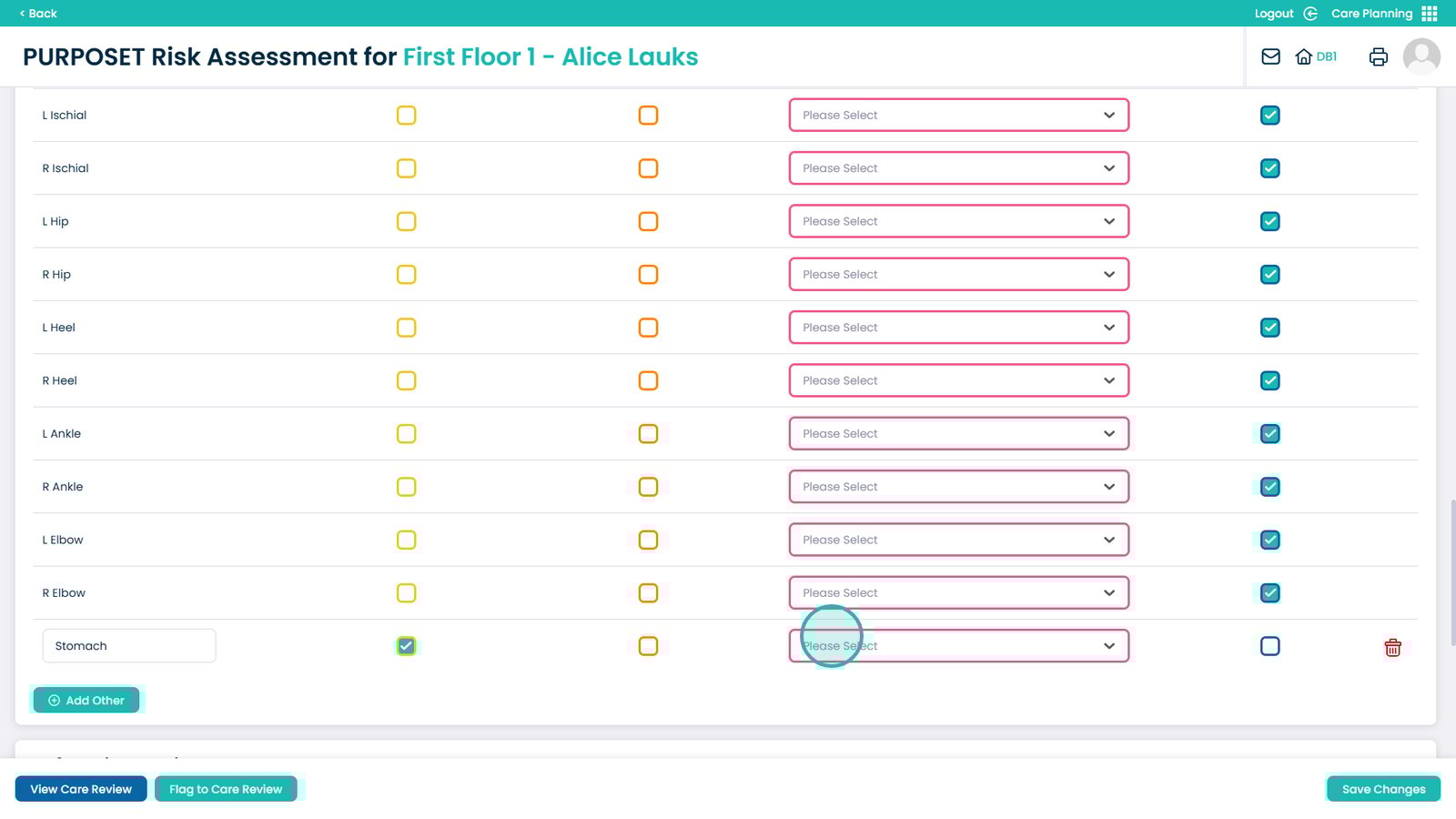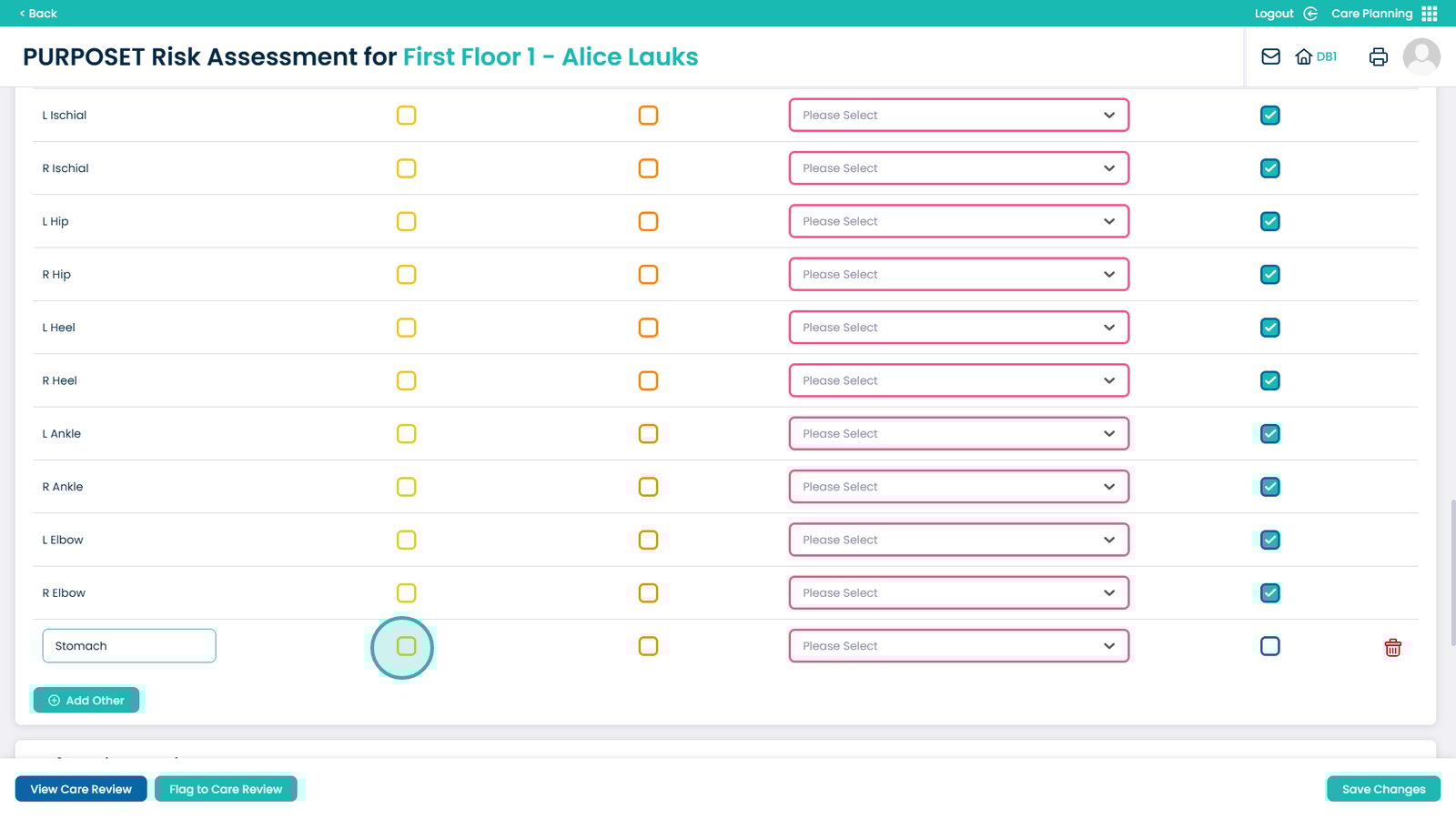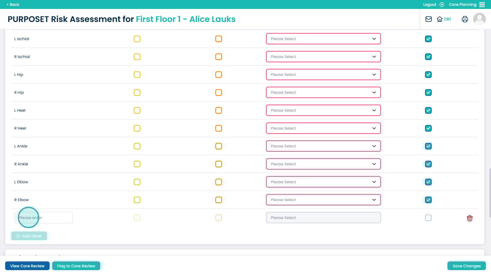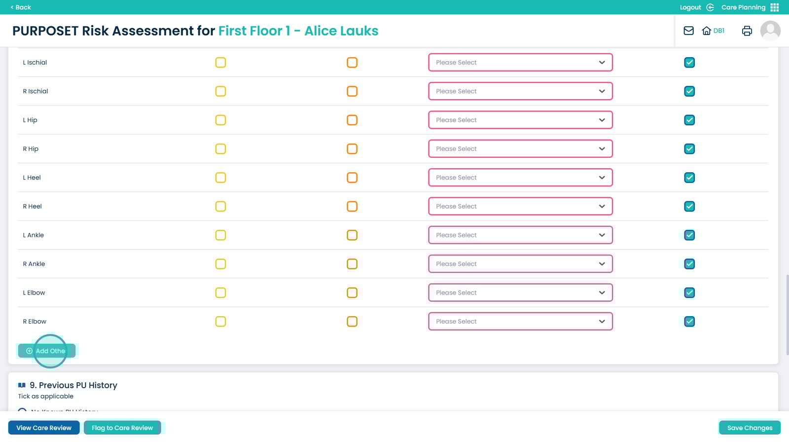 Now fill out the form using all of the options that apply to the service user. This example will show a higher risk of pressure ulcers