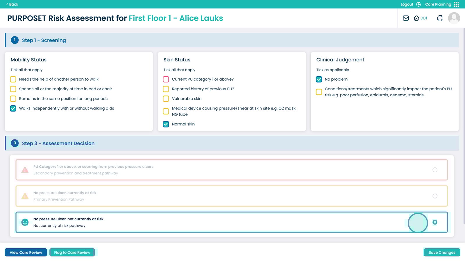 You can now see with our current selections that there are no pressure ulcers and the user is not currently at risk. We will now go back to the beginning and show what a high-risk assessment looks like.