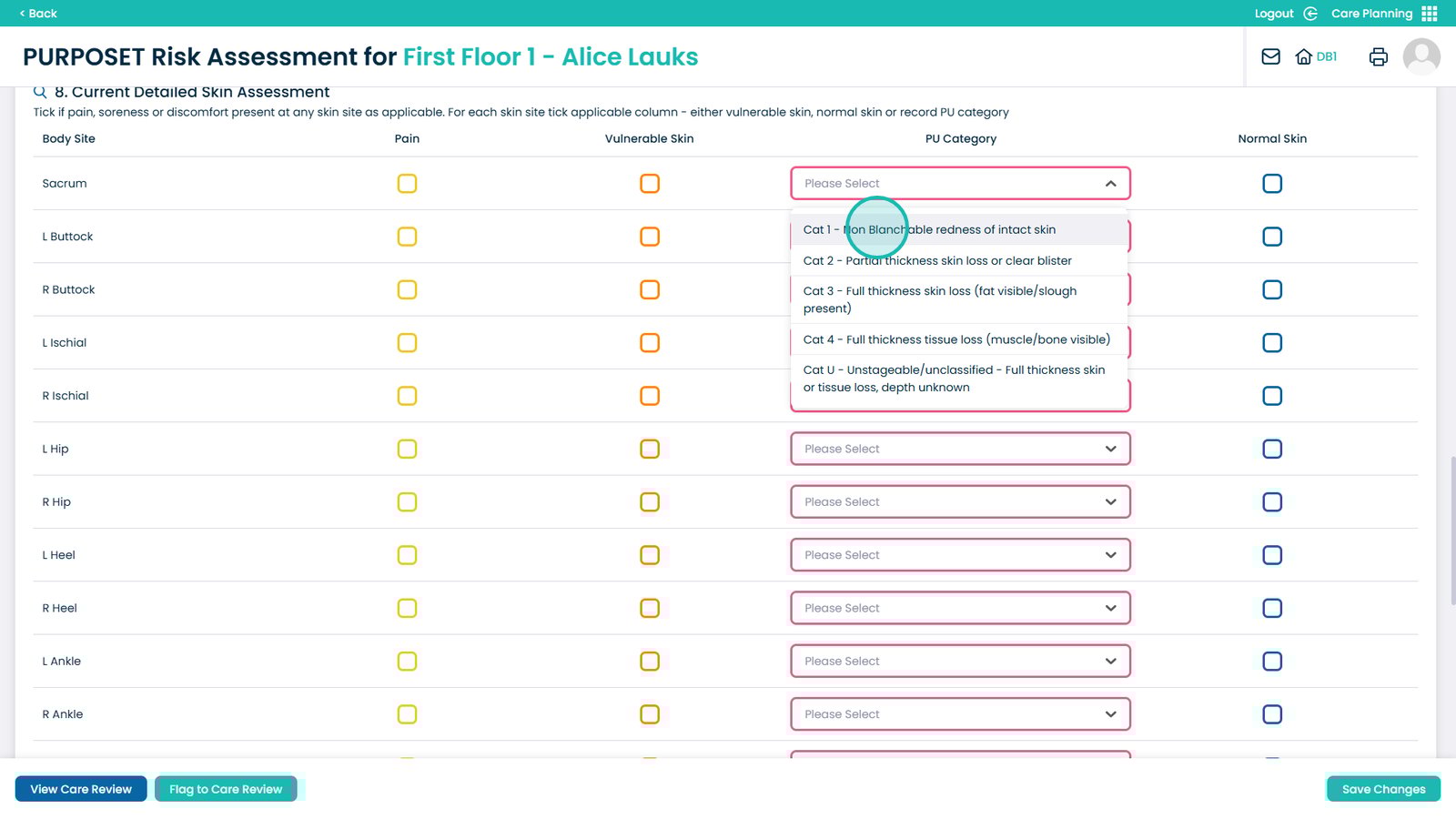 On the detailed skin assessment section, select the PU category first from the drop-down menu