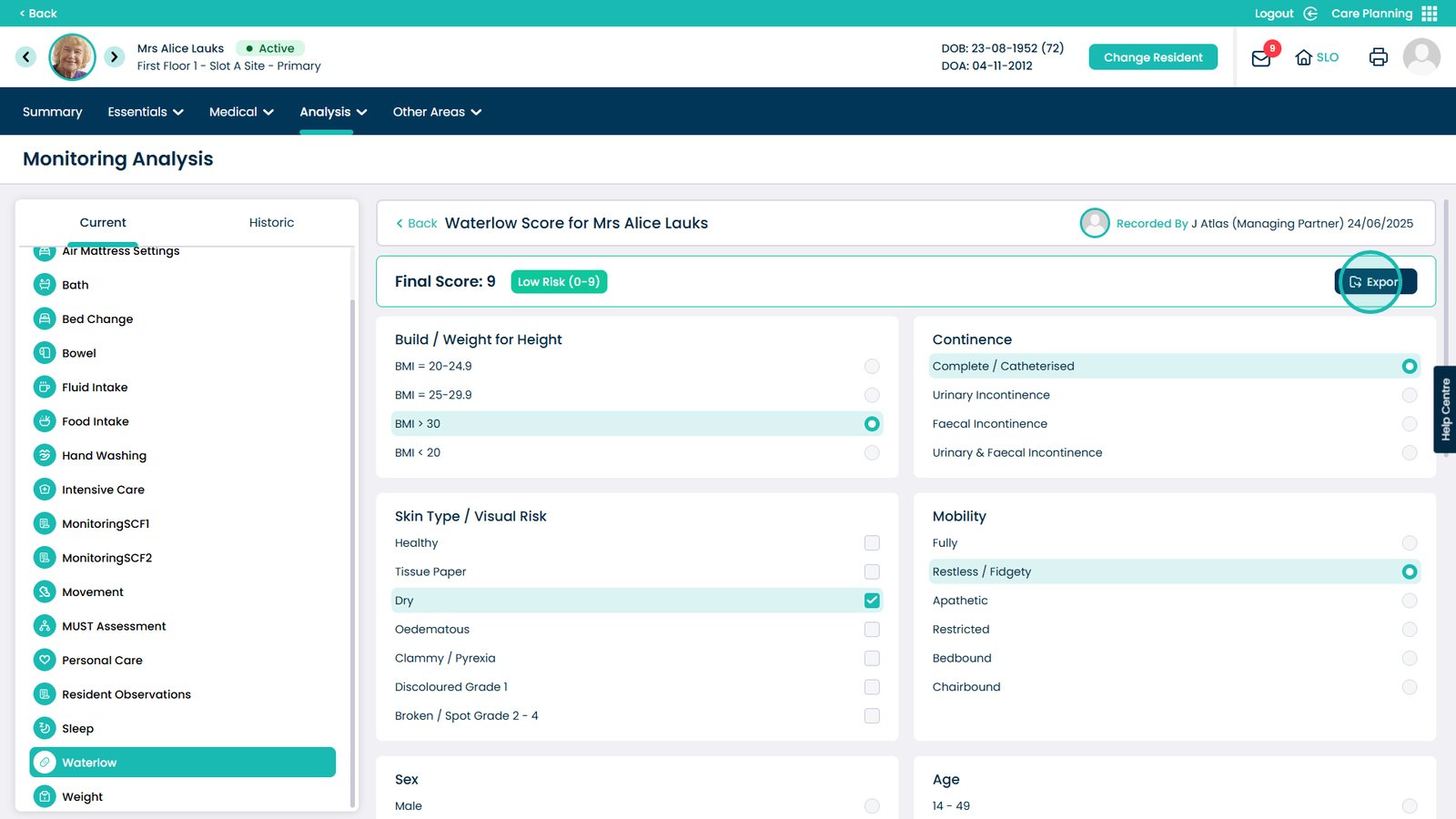 Because it’s fully cloud-based, staff can access and update Waterlow Scores on the go, whether from a tablet during rounds or a desktop in the office. This flexibility supports faster, more responsive care and helps teams stay proactive in managing pressure care risks.