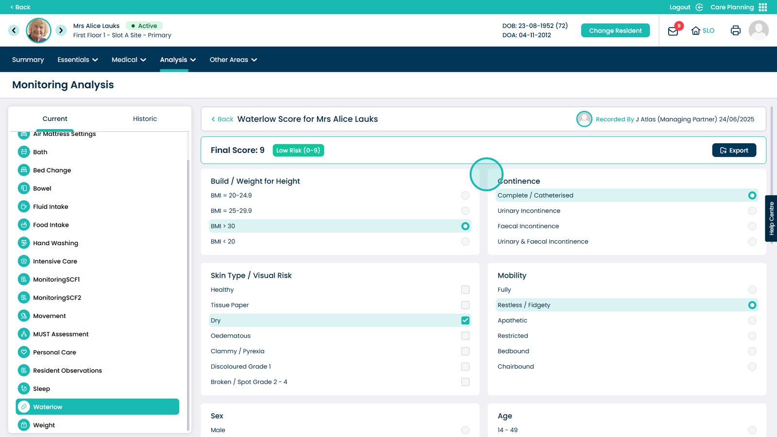 The Waterlow Score recording in Cloud is a valuable upgrade for care teams assessing the risk of pressure ulcers. It allows staff to complete and review assessments quickly, directly within the Care Control Cloud system, from any device. This real-time access improves visibility across teams and ensures that the most up-to-date information is always available.
