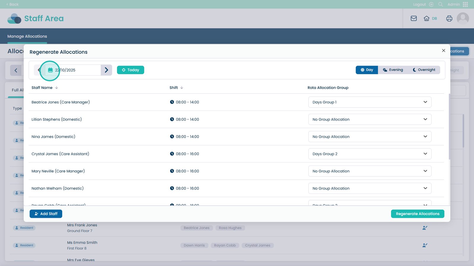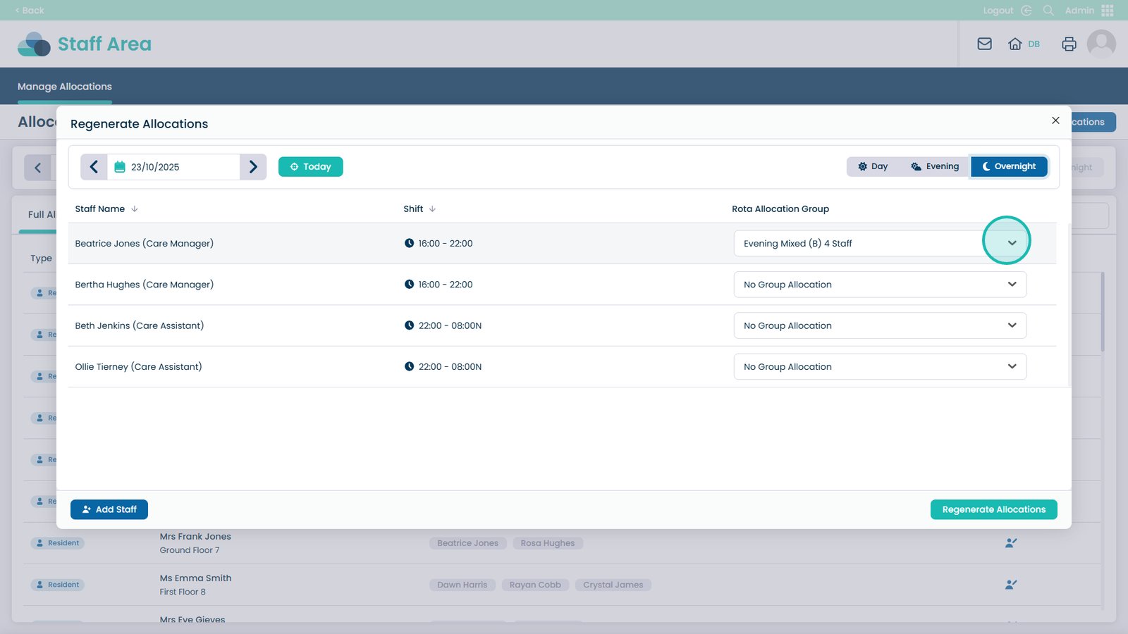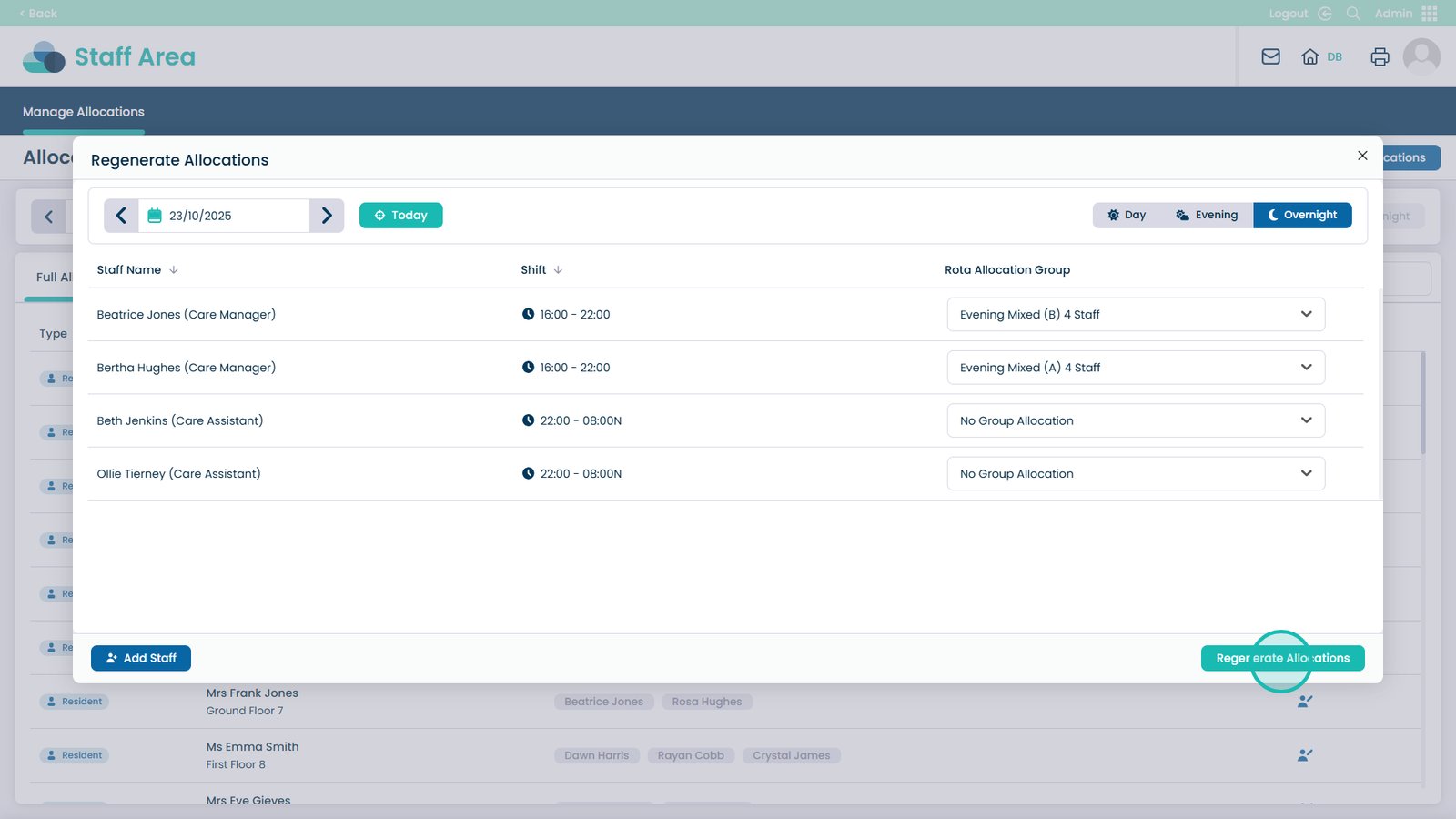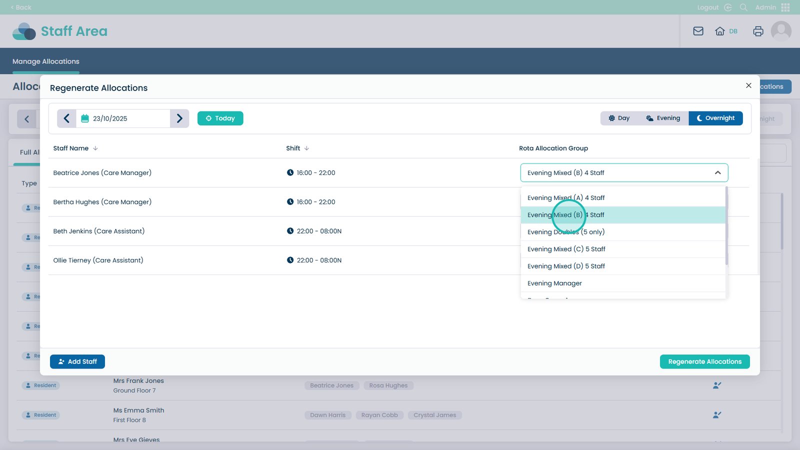 This guide provides a detailed walkthrough on how to regenerate staff allocations within the Care Control Admin App. It is designed to help managers and administrators efficiently manage staff allocations, assign team members to shifts, and update daily staffing arrangements. You’ll learn how to access the Staff Area, navigate the Manage Allocations screen, add or remove care staff, and regenerate allocations for different shift types, including Day, Evening, and Overnight.