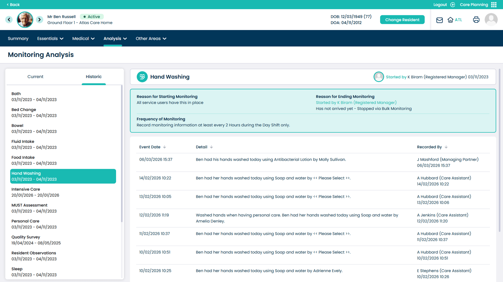 This guide explains how to access and review Monitoring Analysis within the Care Planning app, including navigating through monitoring areas and viewing historical records.
