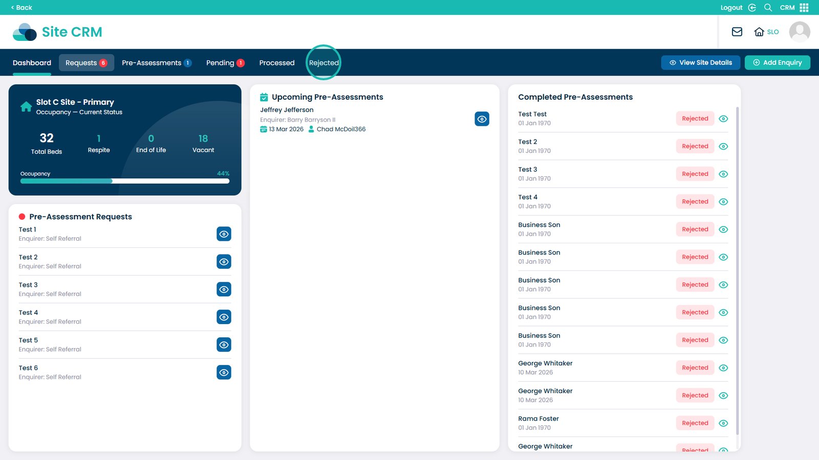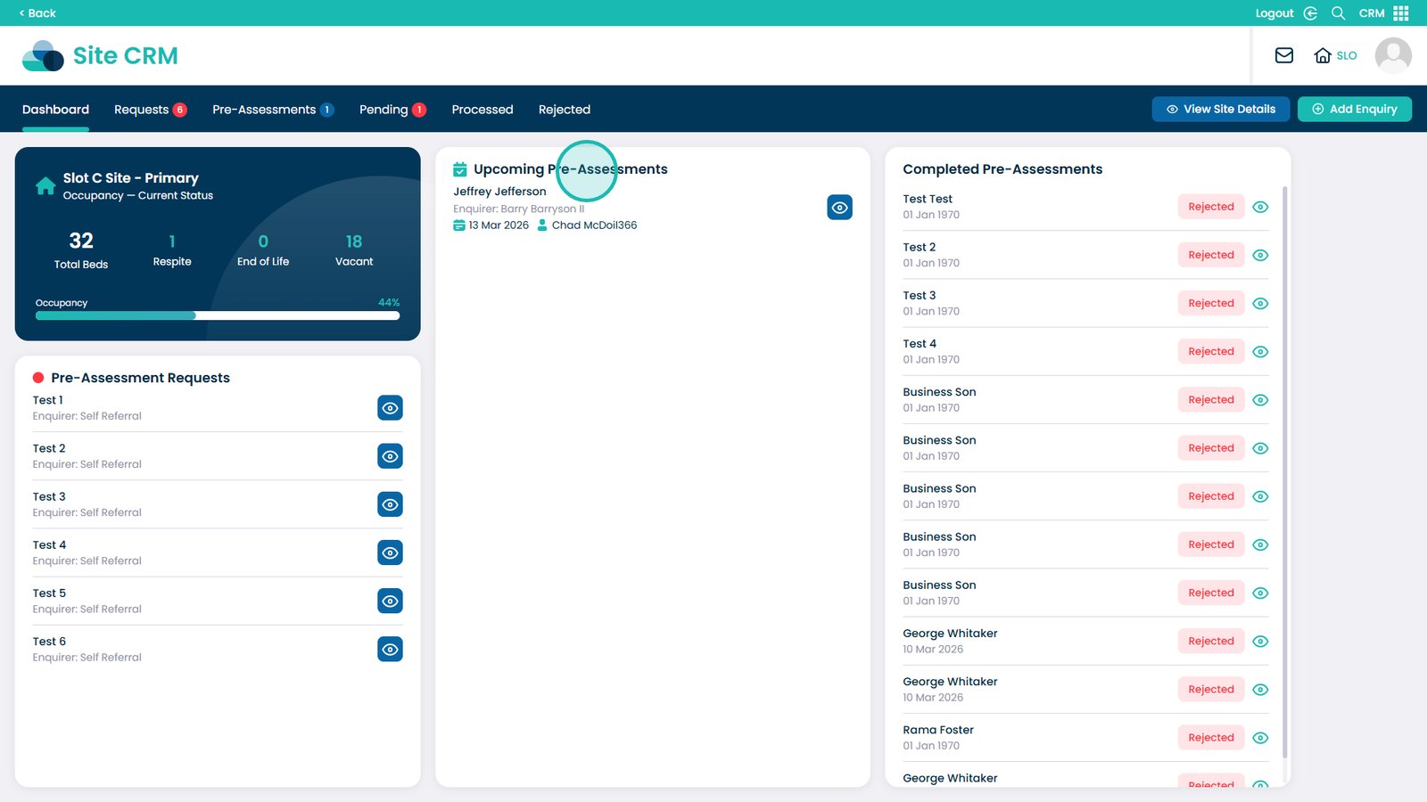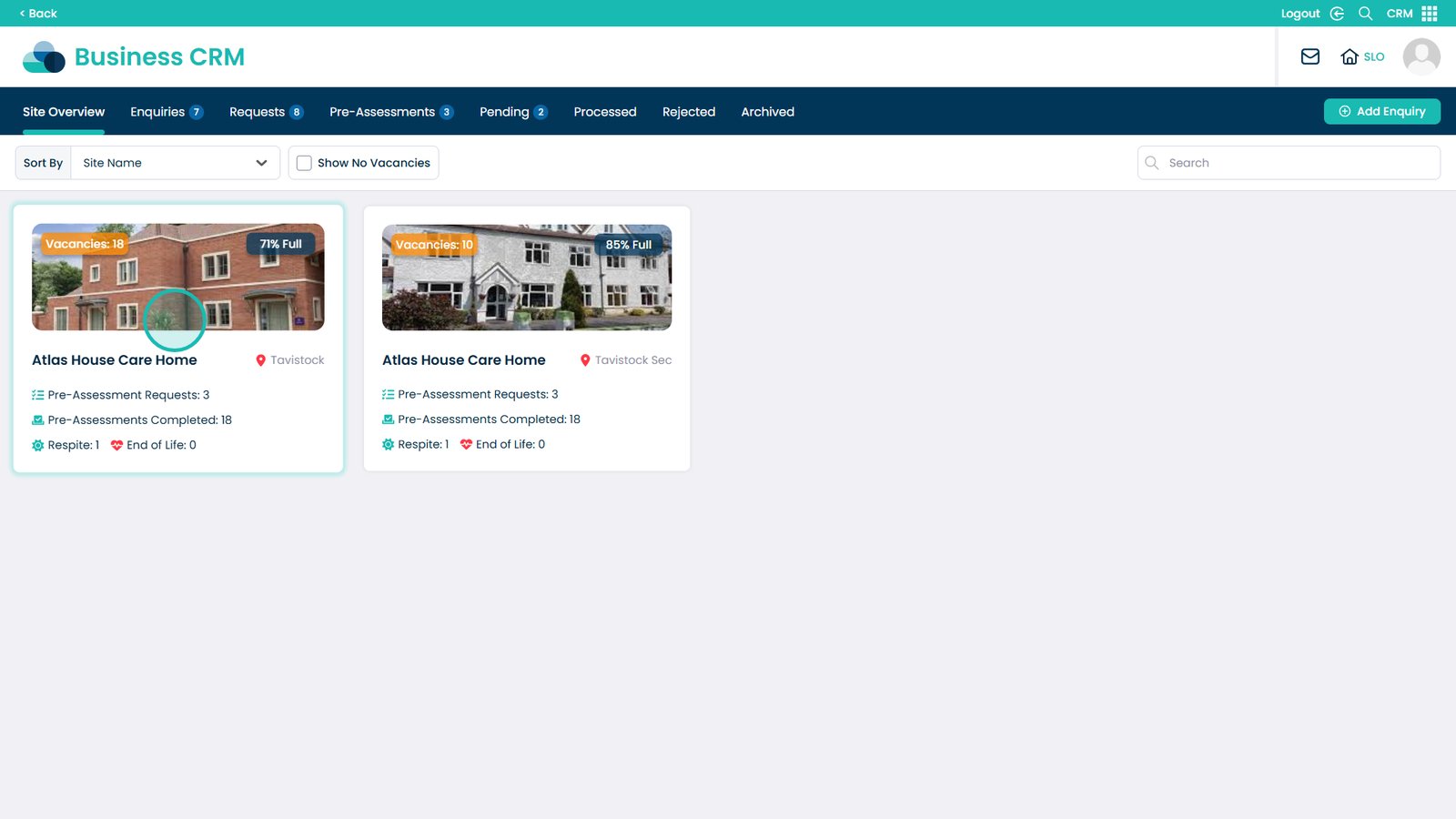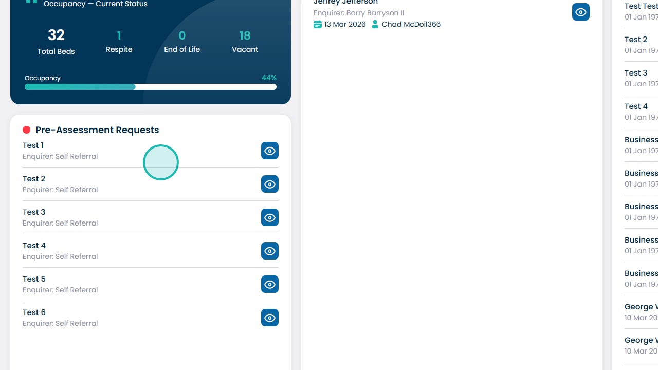 The Site Level CRM Dashboard gives you a centralised view of everything happening at a specific site within Care Control Cloud. It allows you to quickly check home occupancy, bed details, and room availability, as well as track pre-assessment requests at every stage — from incoming requests through to completed and processed assessments. This guide walks you through how to navigate the CRM app, access the site dashboard, and make use of the tabs available to stay on top of your enquiries and admissions pipeline.