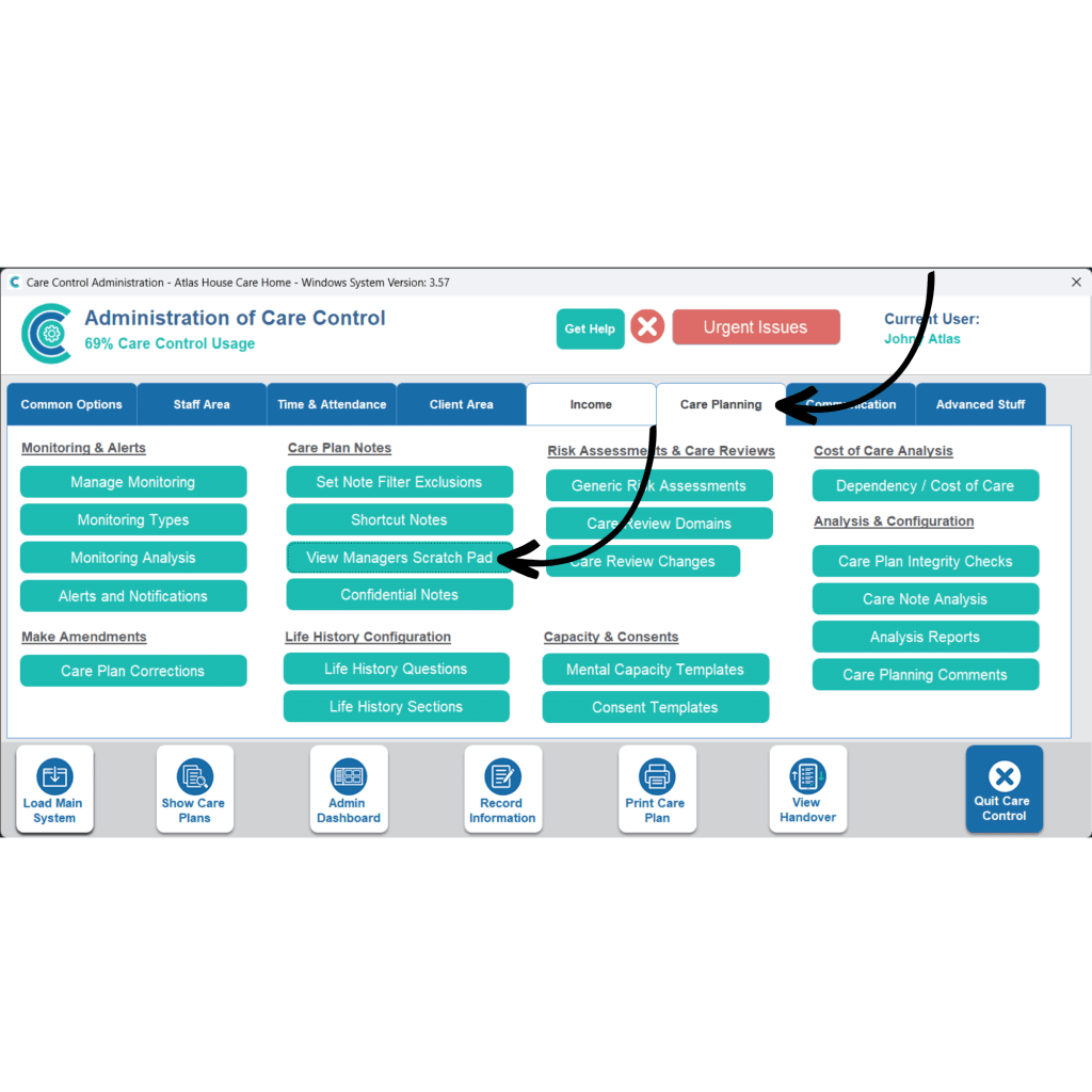 In the Administration of Care Control Windows, navigate to the Managers Scratch Pad tool, which can be found under the Care Planning tab.