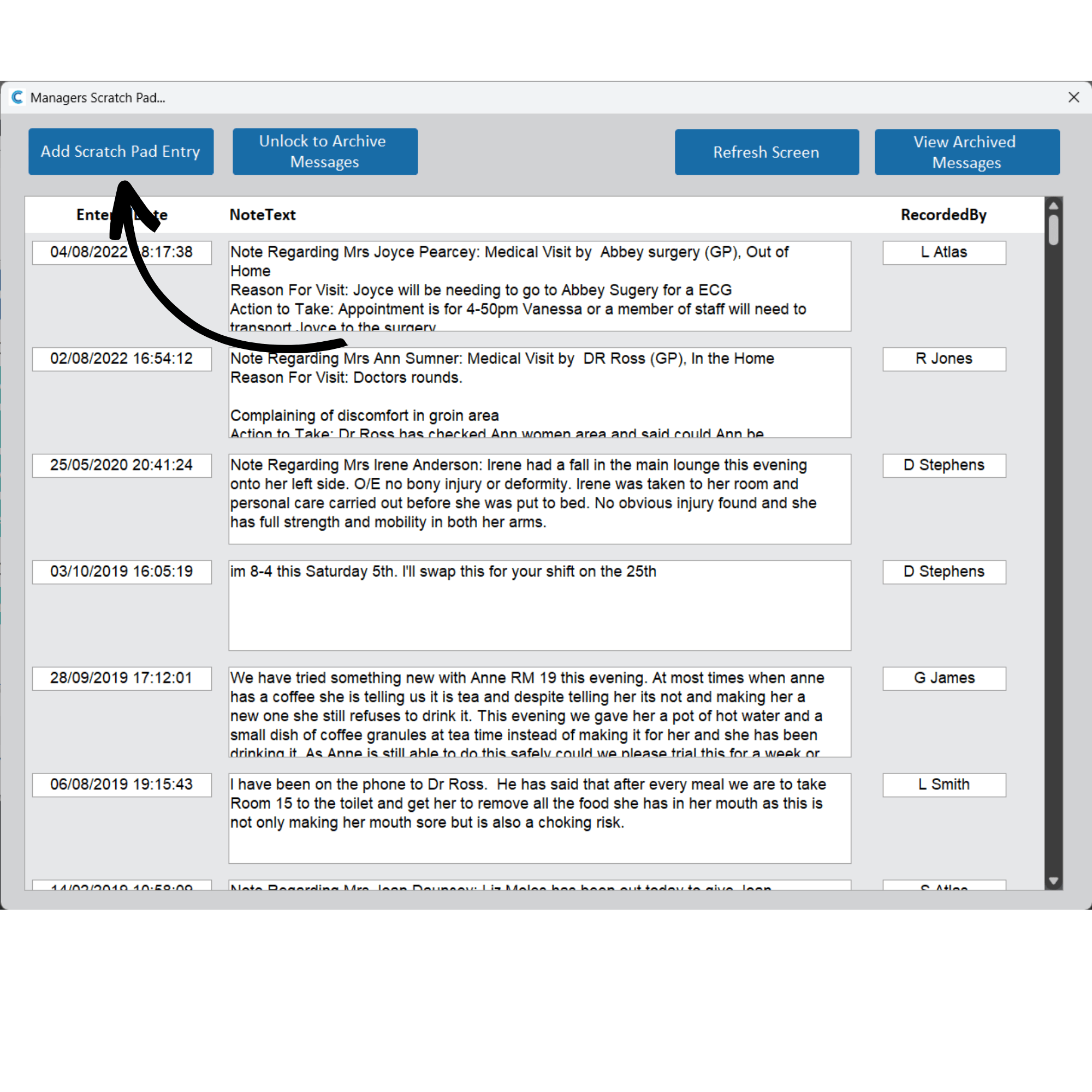 This guide will cover how to use the Managers Scratch Pad on CC Windows. This tool acts as an area where admin staff can quickly record information for other admin staff members to read. This feature works well as a manager handover note facility.