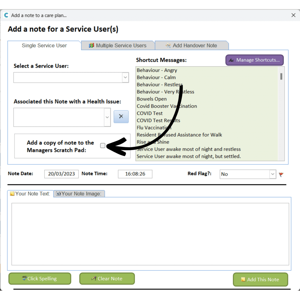 You can also link General Notes to the scratch pad. When recording a general note, simply tick the box titled Add a copy of note of the Managers Scratch Pad.