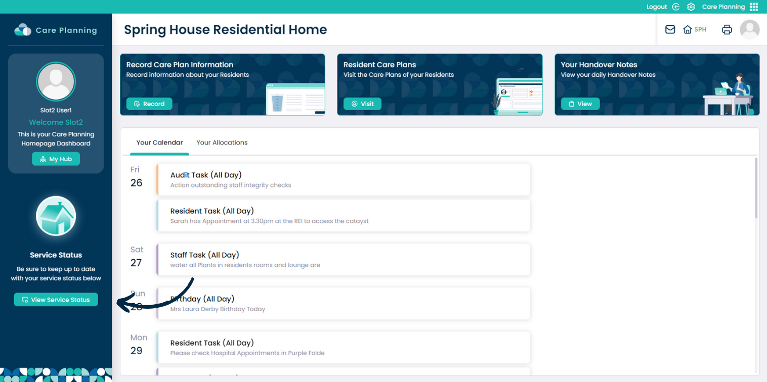 In the Care Planning application within Care Control Cloud, navigate to the View Service Status tool on the left hand side of the page.