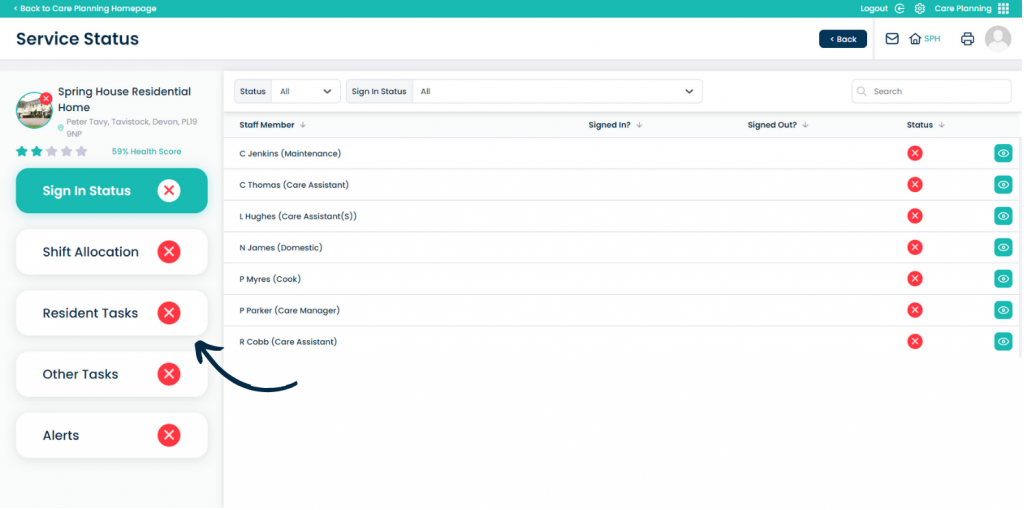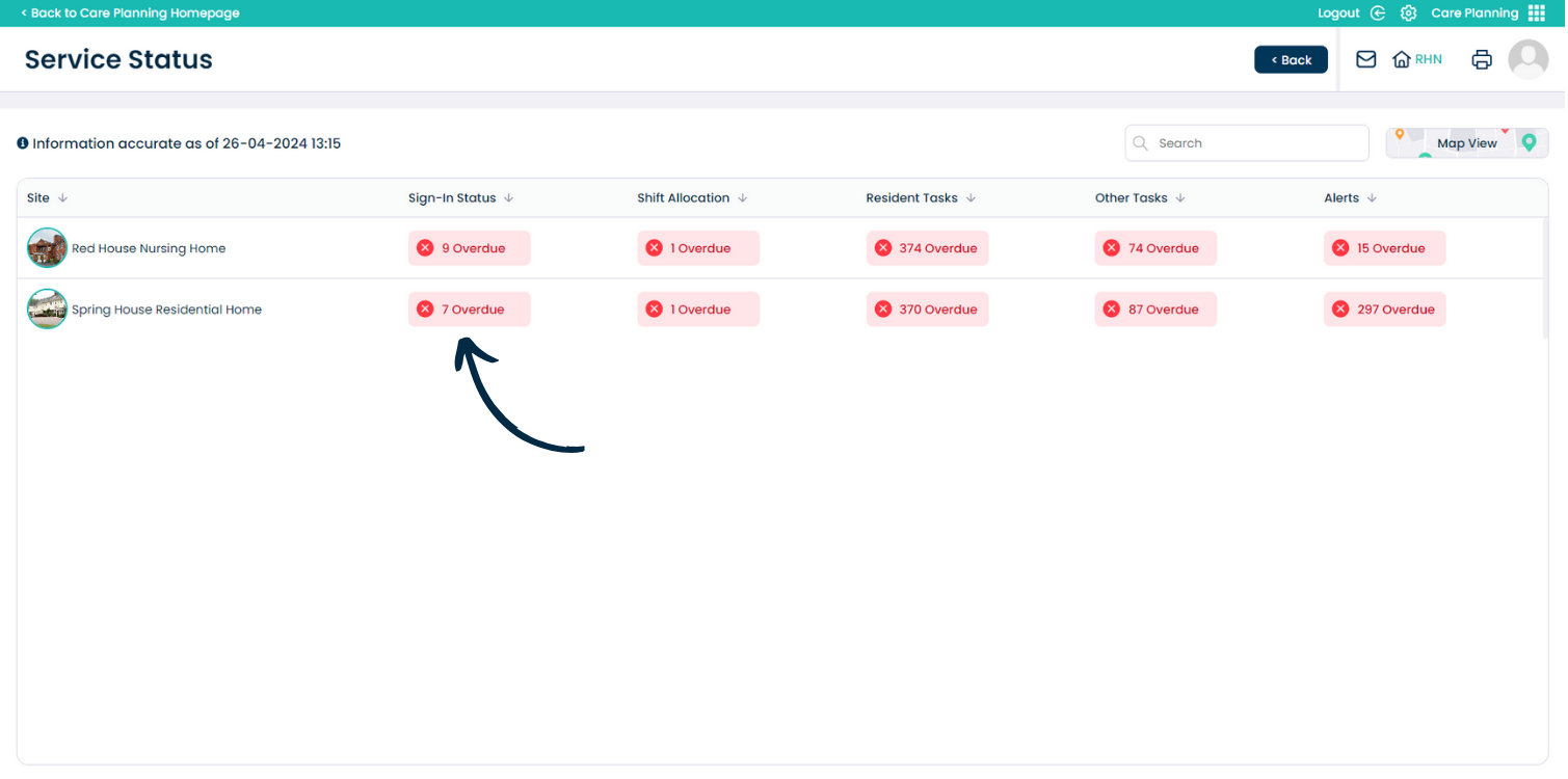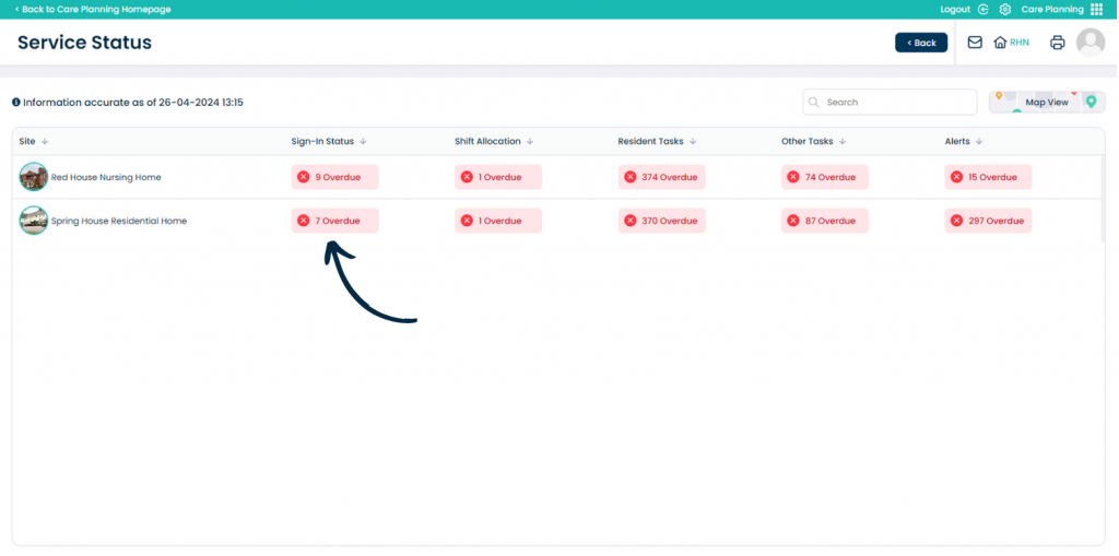 The Service Status will open in Table View. Here, a list of the sites within your organisation will be displayed (or the sites you have access to). A summary of the Sign-In Status, Shift Allocation, Service User Tasks, Other Tasks and Alerts are shown.