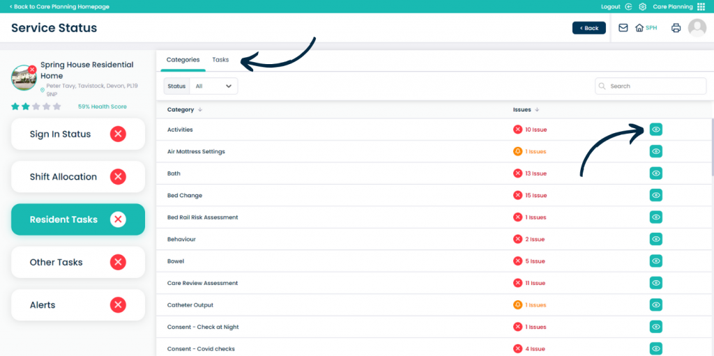 When viewing in categories, the tasks are organised into recording areas. Simply press the Eye Icon to view all the tasks within the category.