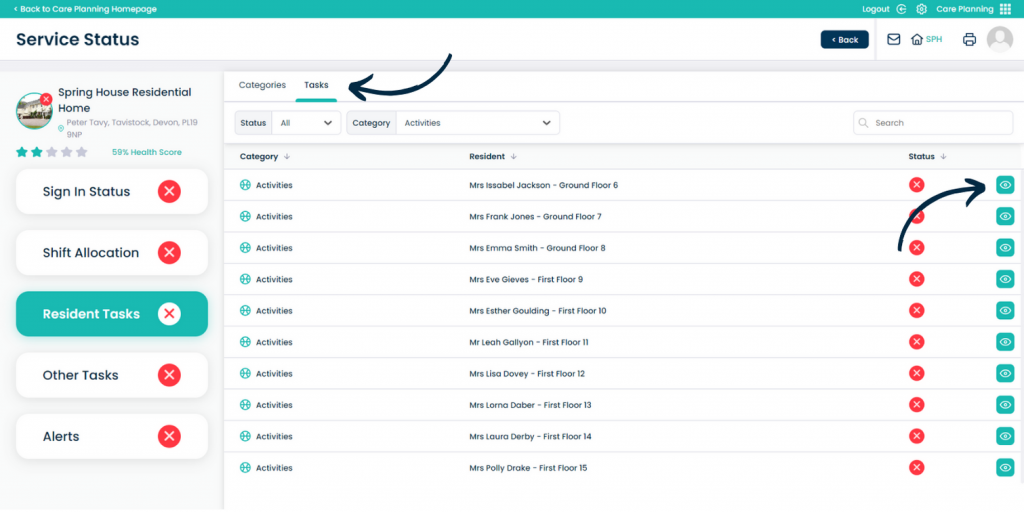 Here, a full breakdown of the tasks and their associated service user is displayed. Press the eye icon again to open the task.