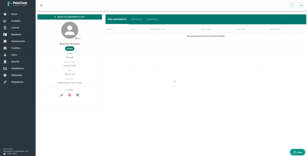 After starting the monitoring, we can see that the service user appears within PainChek.