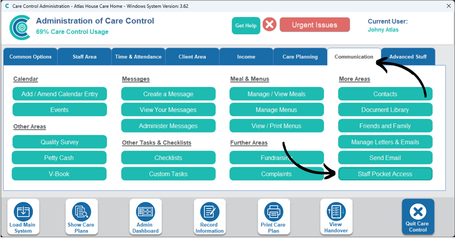 In the Administration of Care Control Windows, navigate to the Staff Pocket Access tool, which can be found under the Communication tab.