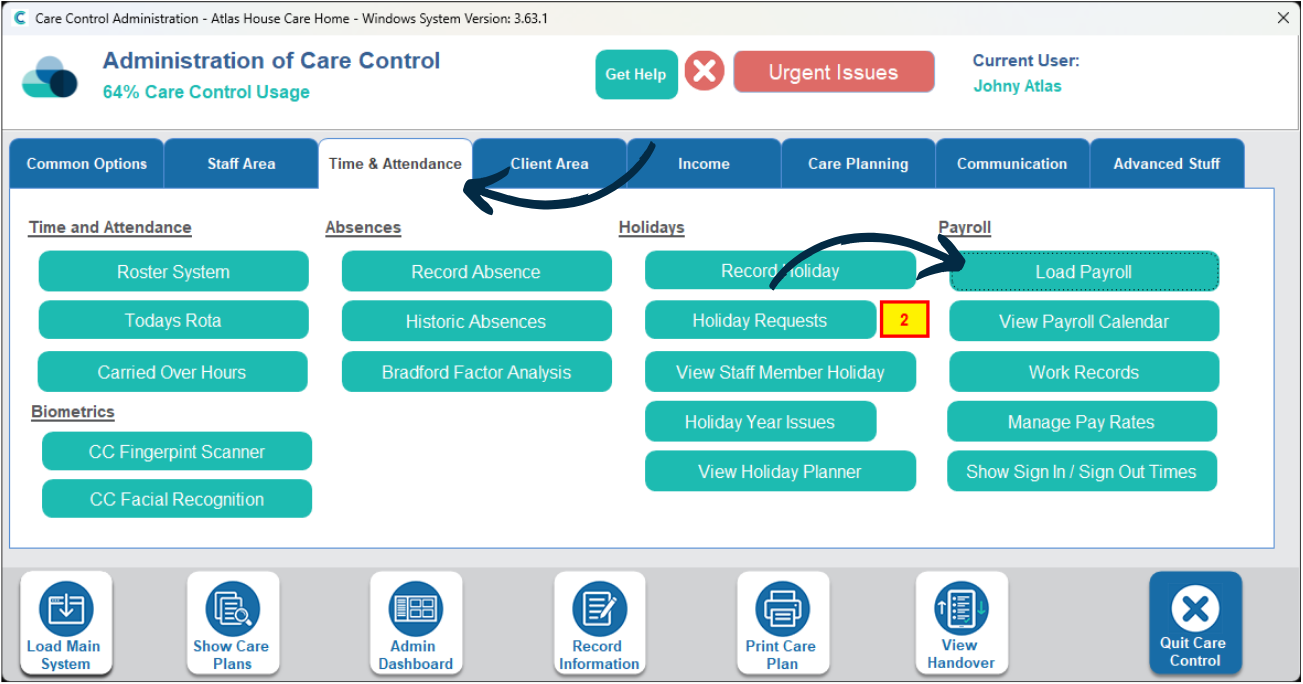 In the Administration of Care Control Windows, navigate to the Load Payroll tool, which can be found under the Time & Attendance tab.