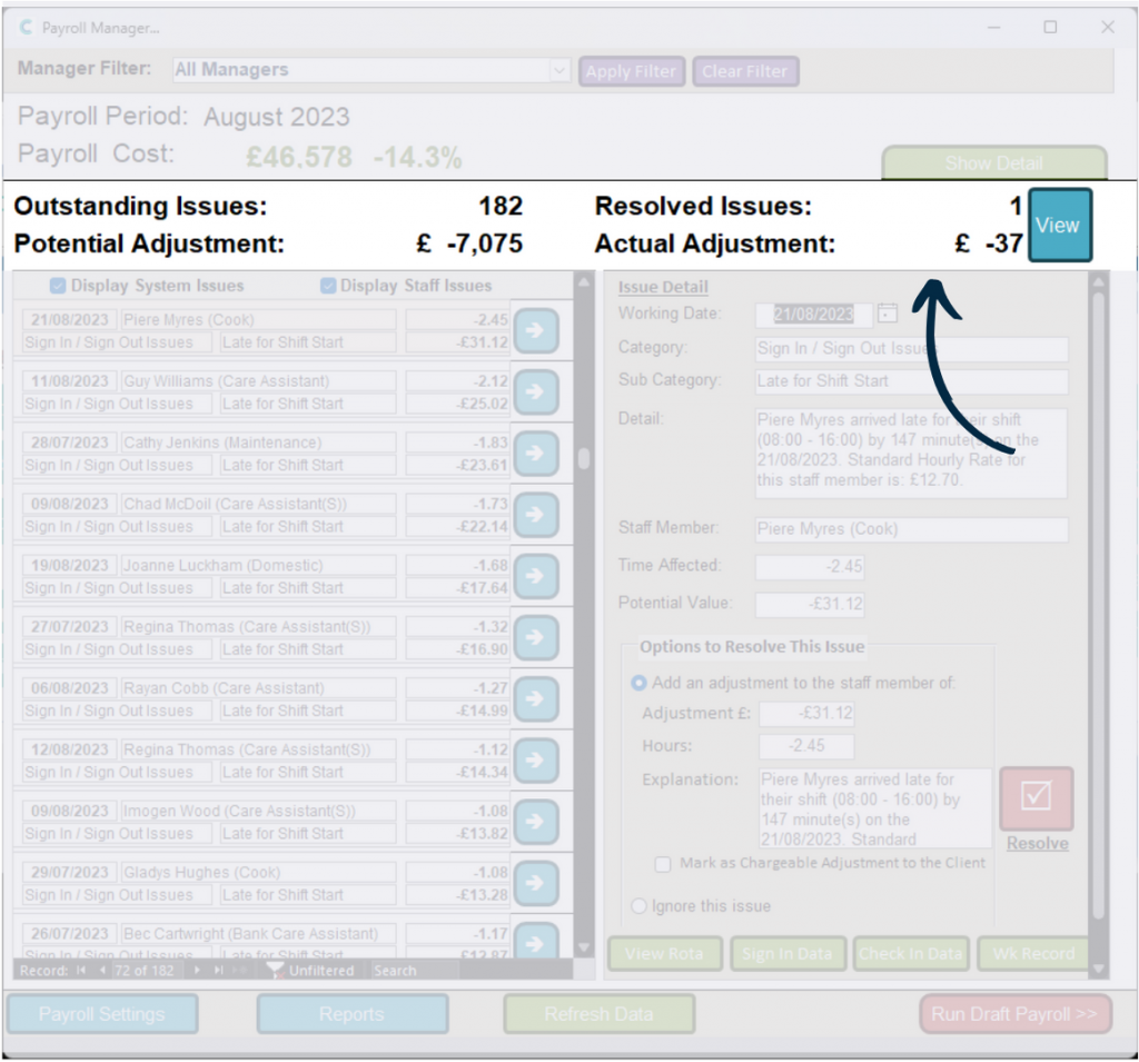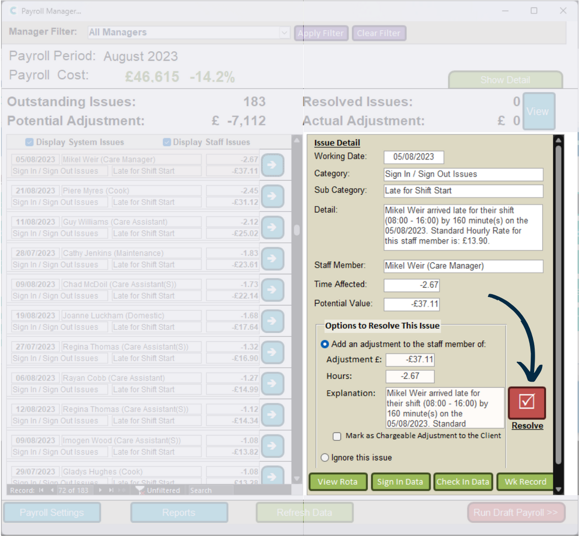 In this example, the staff member was late for a shift start by 160 minutes. This equates to 2.67 hours and therefore £37.11. We can view the supporting data via the buttons at the bottom – View Rota, Sign In Data and Check In Data