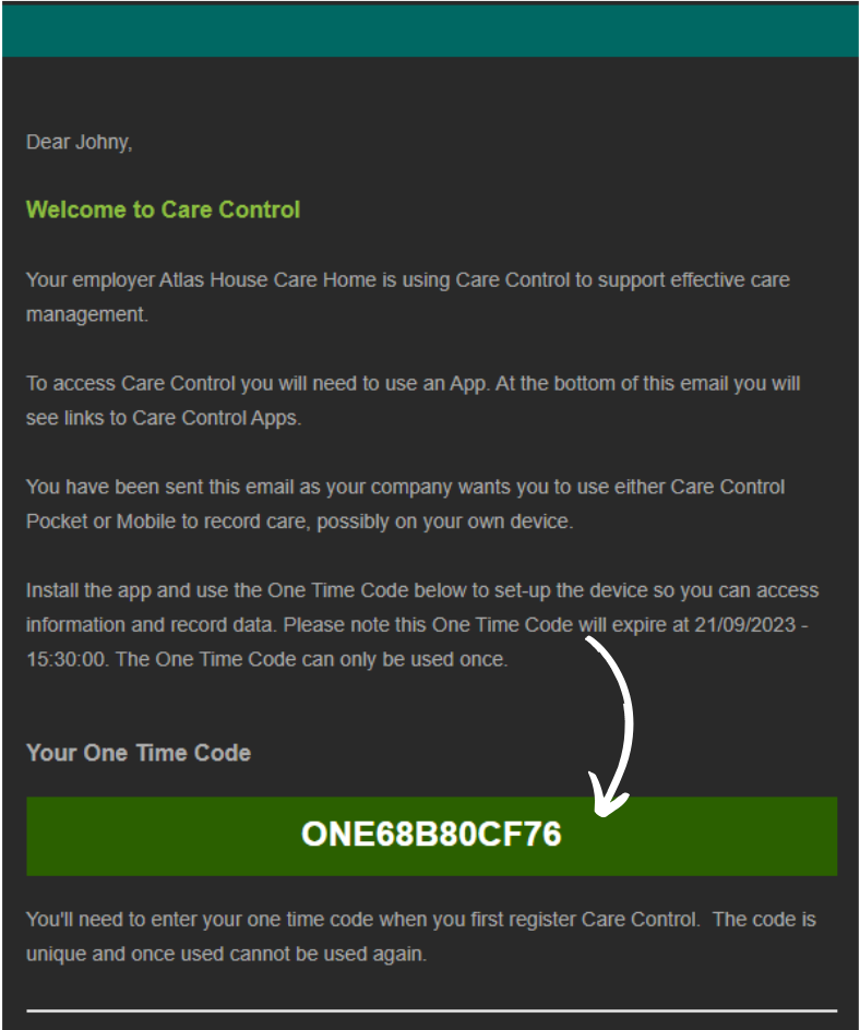 This is what the OTC email will look like. It contains the code in the green box for staff to use to register their devices.