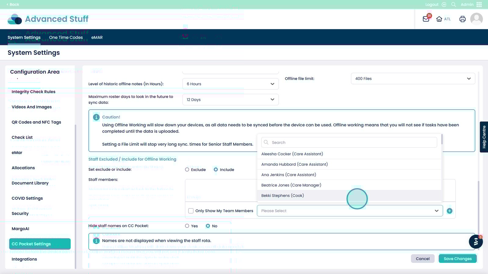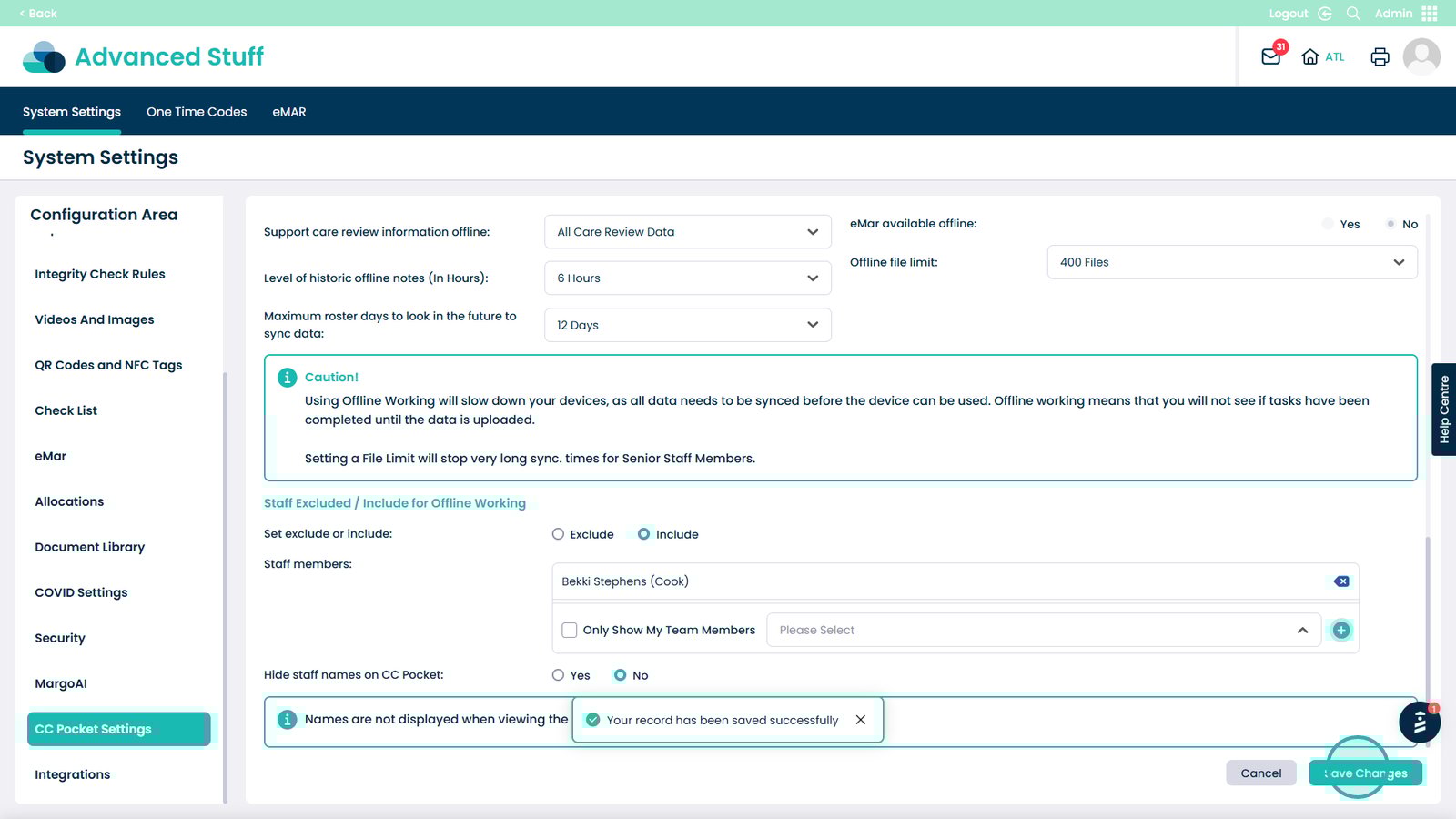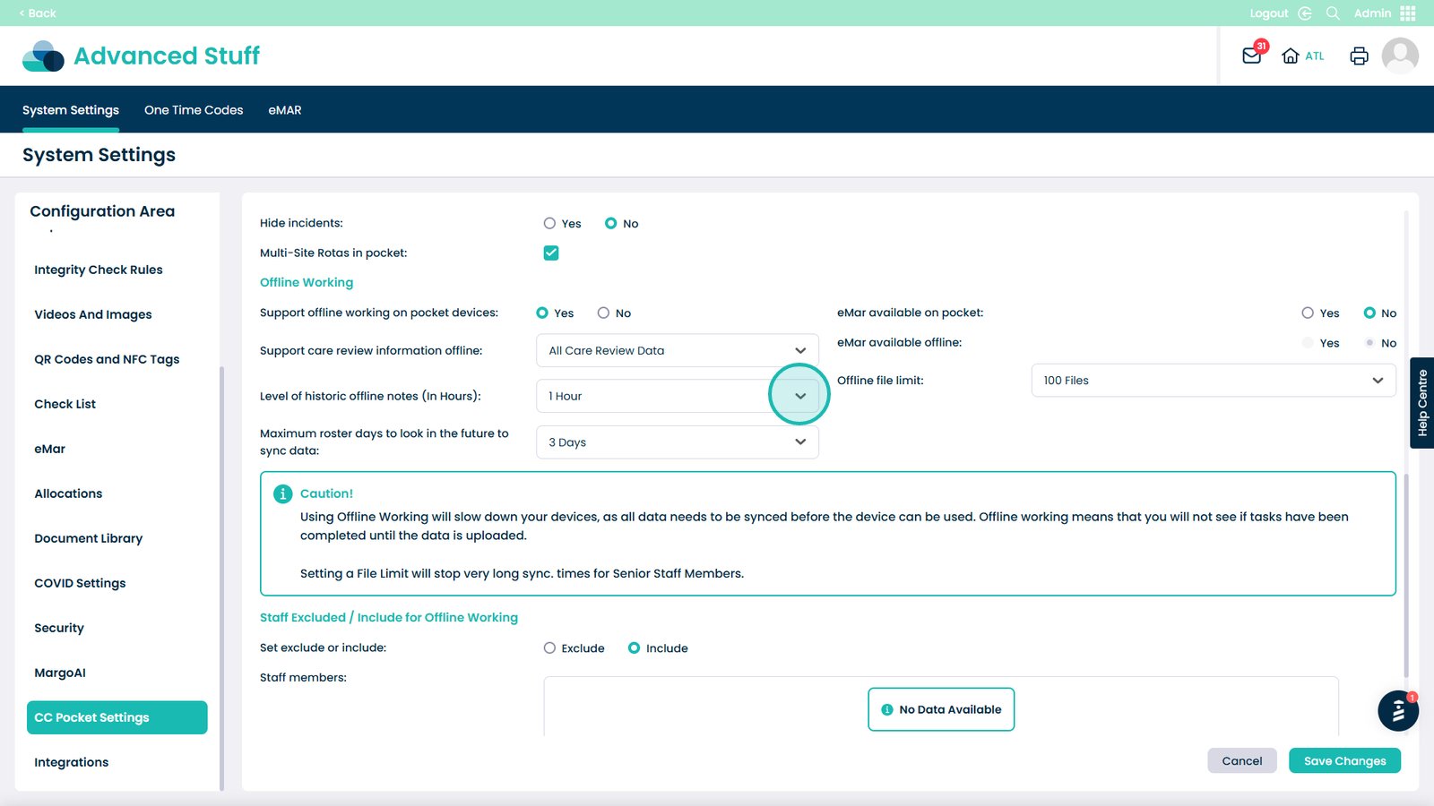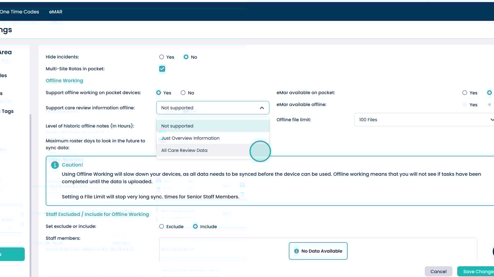 It also offers flexibility for managers, who can configure how much information is stored offline, such as the level of care review details, historic notes, and file limits. This balance between accessibility and control makes the feature both practical and secure, ensuring continuity of care while preventing unnecessary data storage.