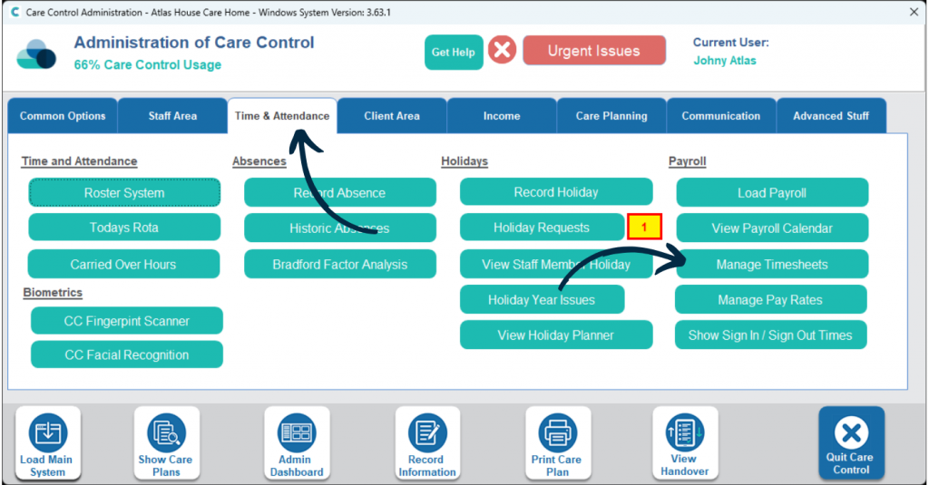 In the Administration of Care Control Windows, navigate to the Manage Timesheets tool, which can be found under the Time & Attendance tab.