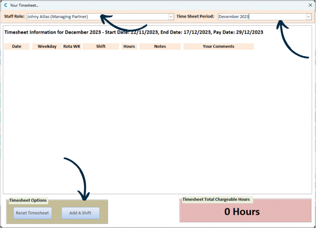 A series of shifts will be displayed for the selected period, according to the rota. If there is a shift you need to add for the payroll, press Add A Shift.