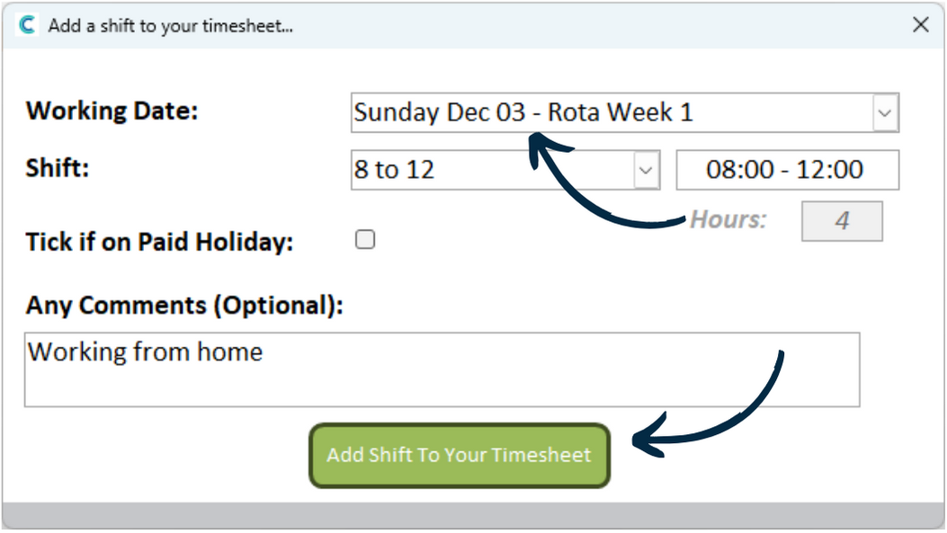 Select the Working Date from the drop-down list and select a Shift. This will give a number of hours worked.