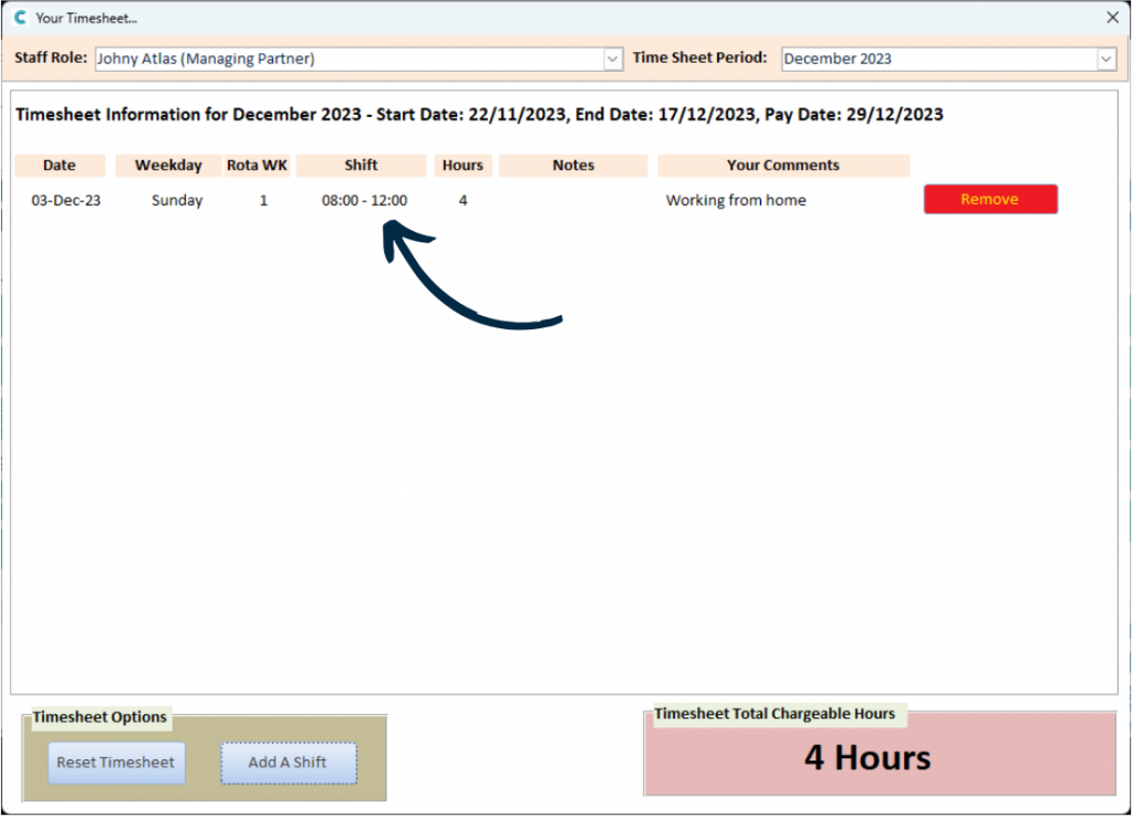 The new shift will appear in the timesheet. Notice how the Chargeable Hours has increased in the bottom right corner.