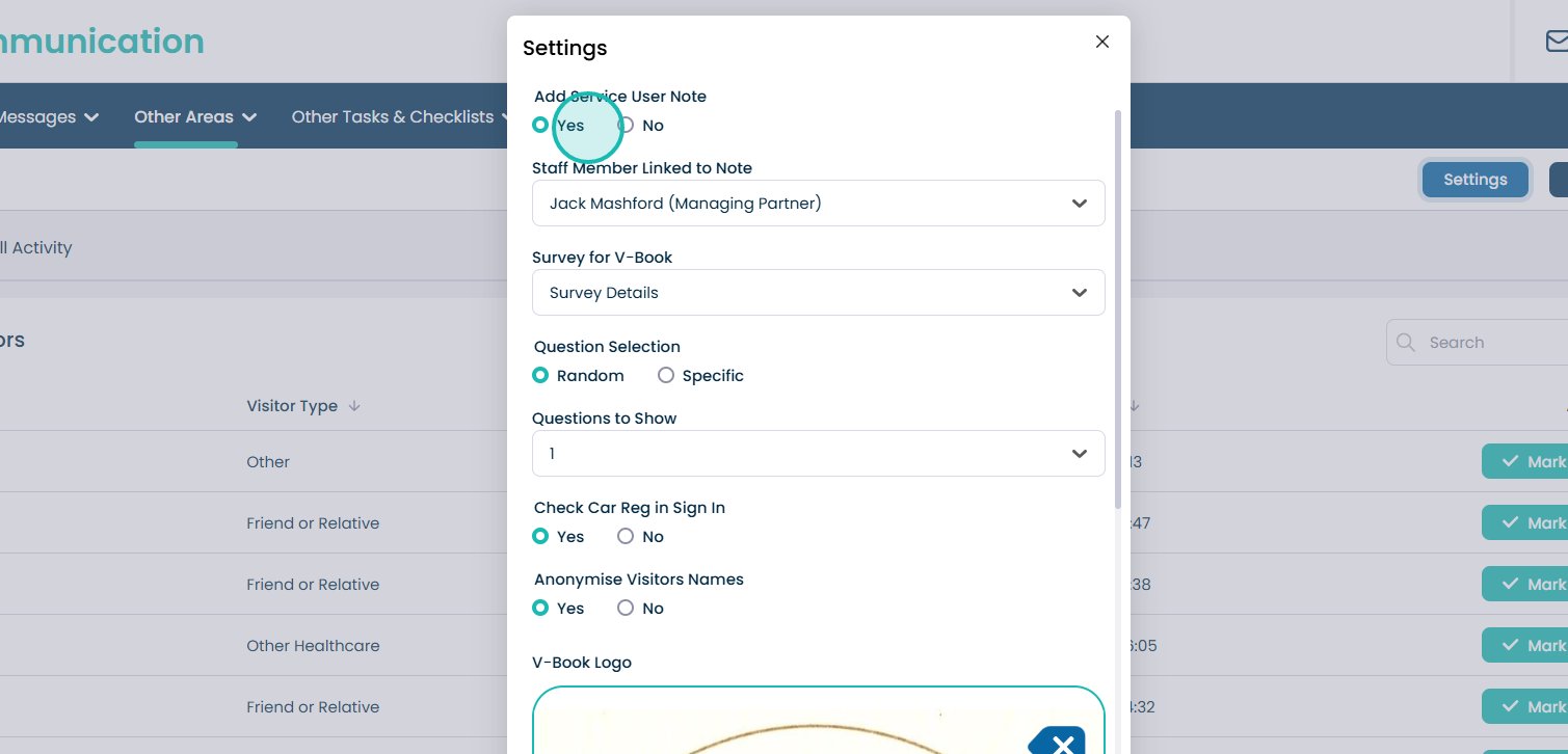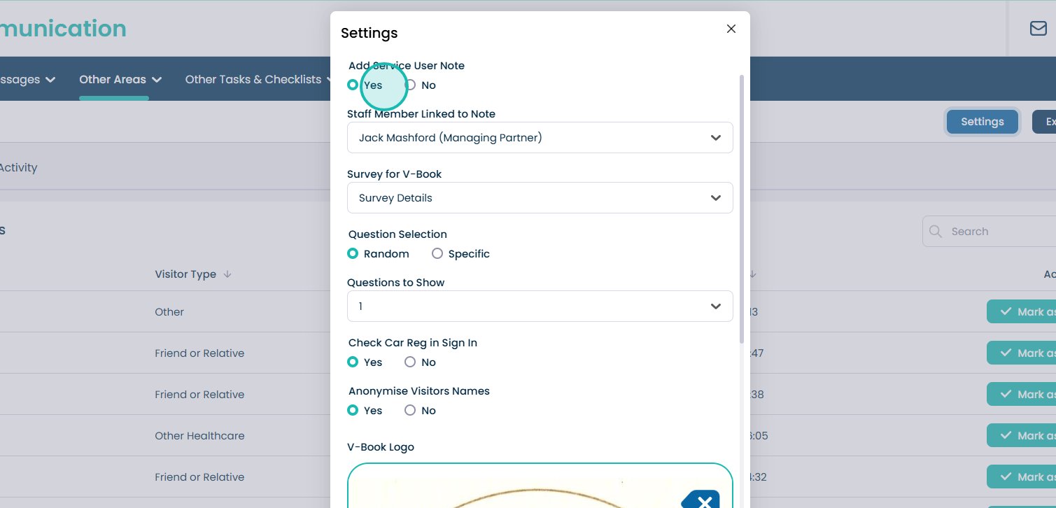 8. Add Service User Note – when Yes, a note will be recorded on the Care Plan for the service user in question that a visitor has been.