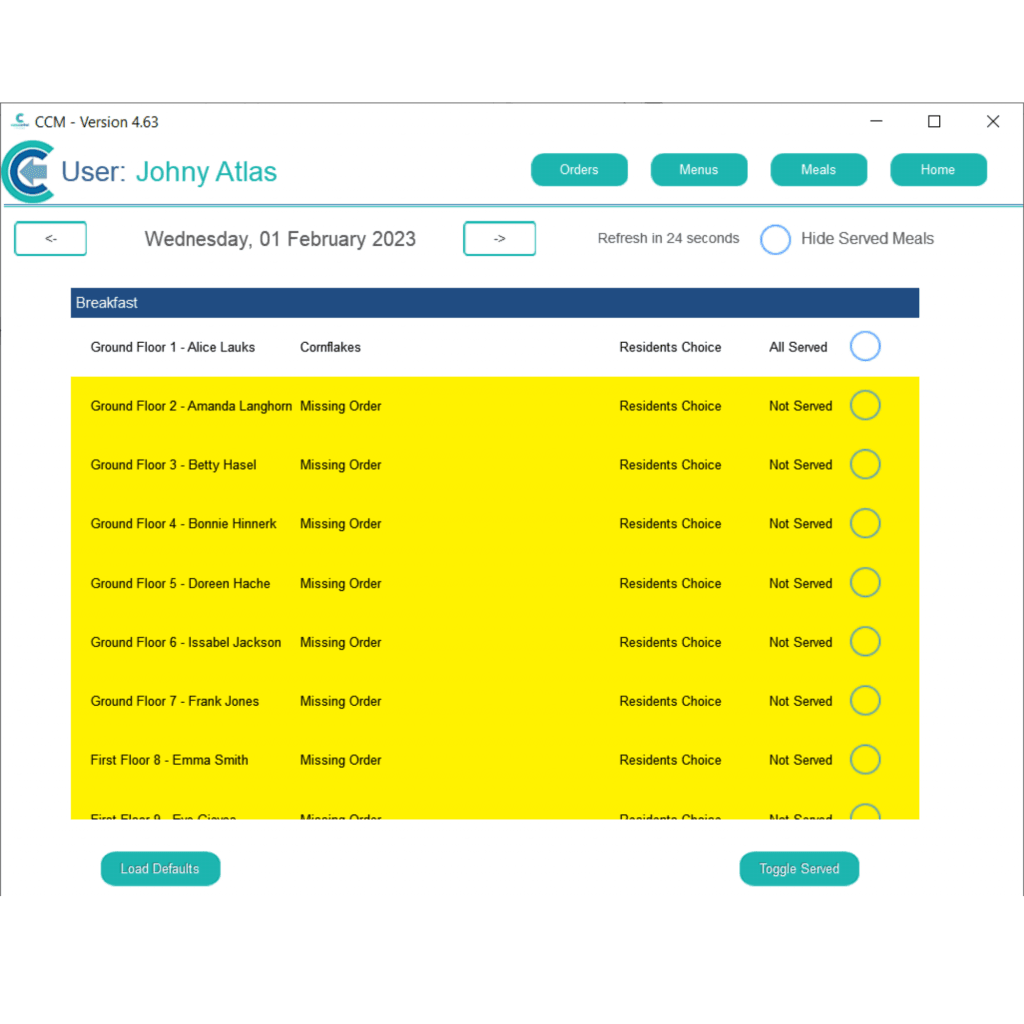The meal order will now be displayed. When the meal has been served from the kitchen, tick the meal using the tick-box on the right-hand side of the screen, and then press Toggle Served.