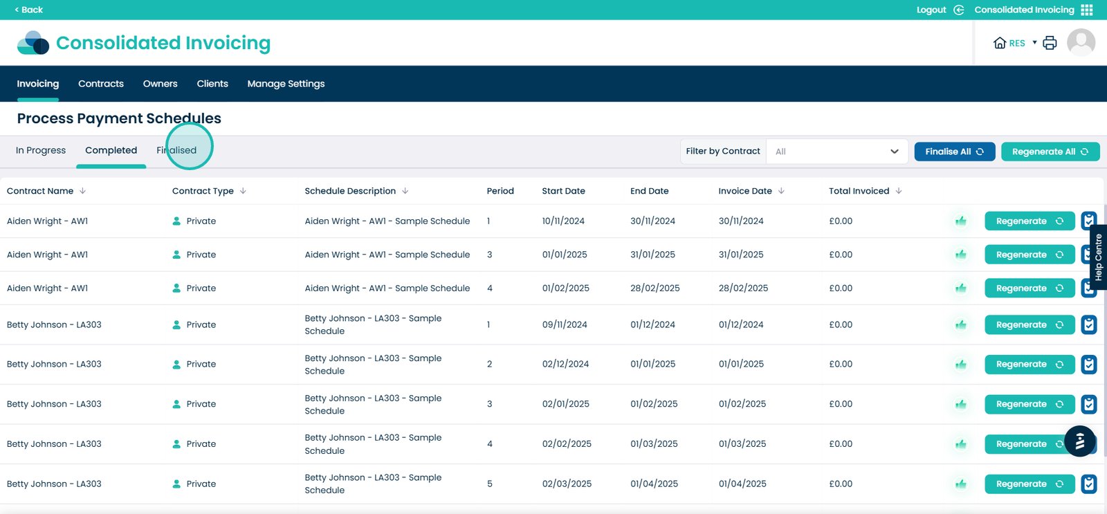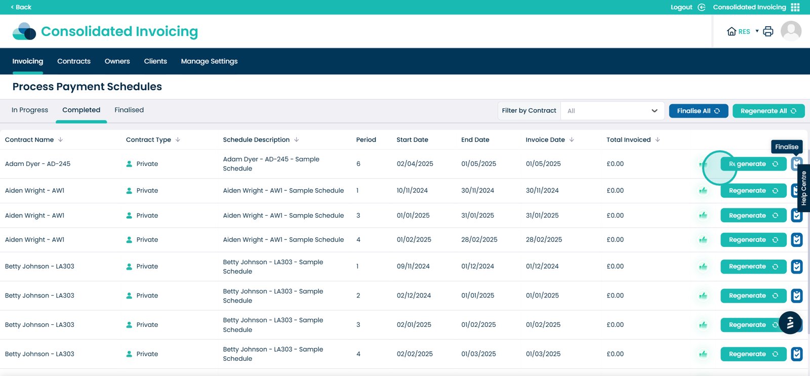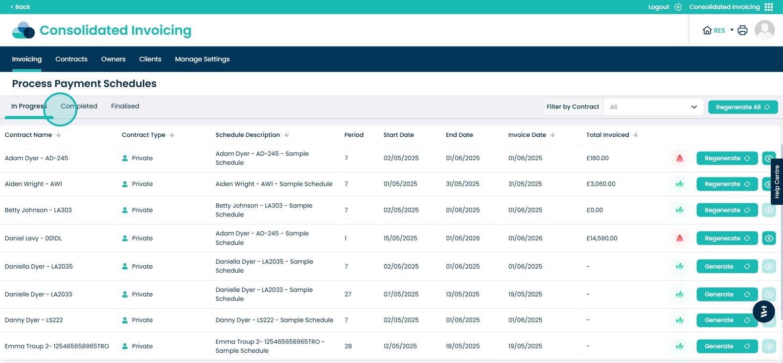 Find the right contract and select the ‘Generate button’ if the Total Invoice has yet been generated for that particular contract.